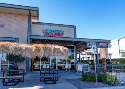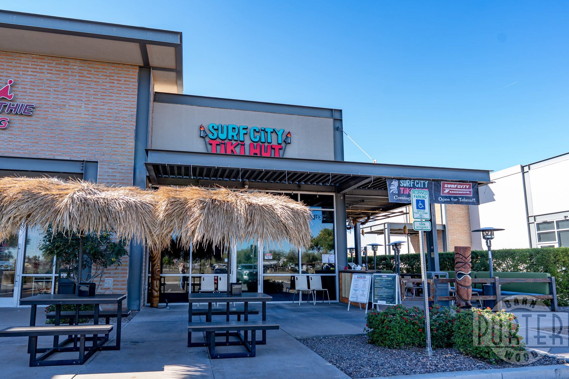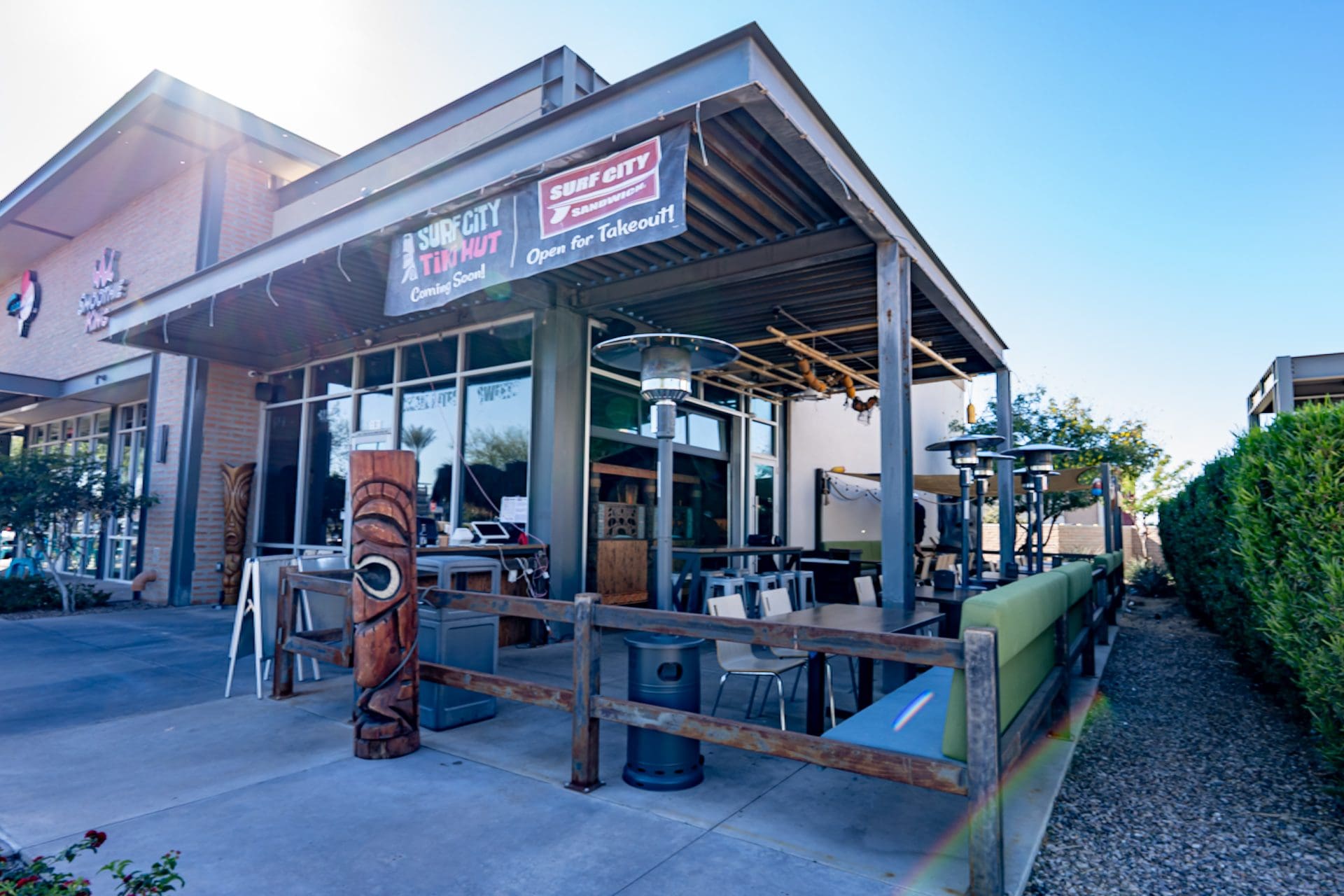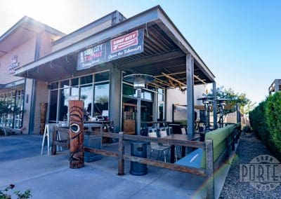 Bold beams make up the framework of this local tiki destination. This well-defined space provides plenty of shade for patrons to enjoy a cool drink and a hearty sandwich.