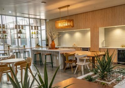 This hackberry live-edge table, with a custom-made steel base, is a communal gathering location for coffee or business meetings alike.