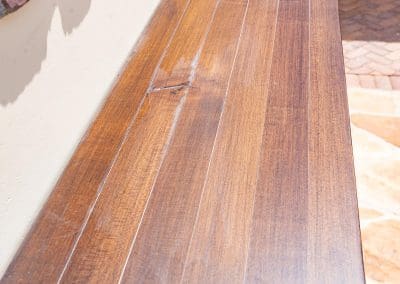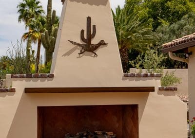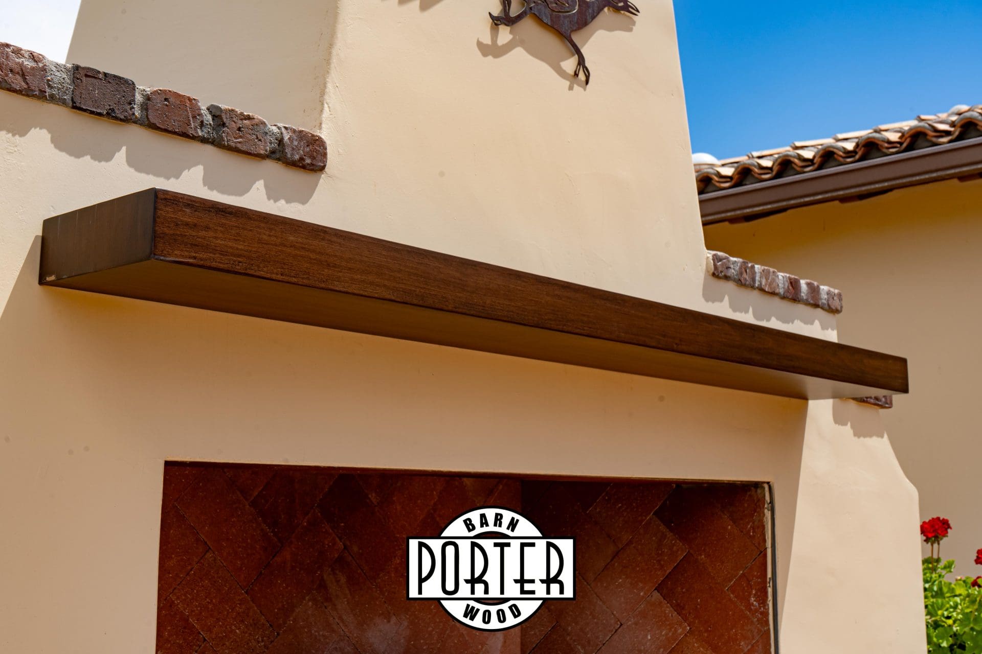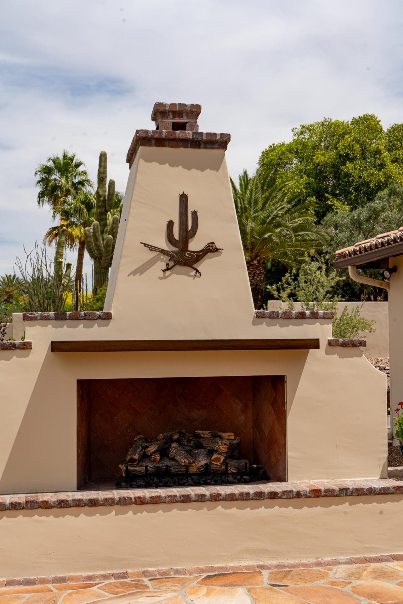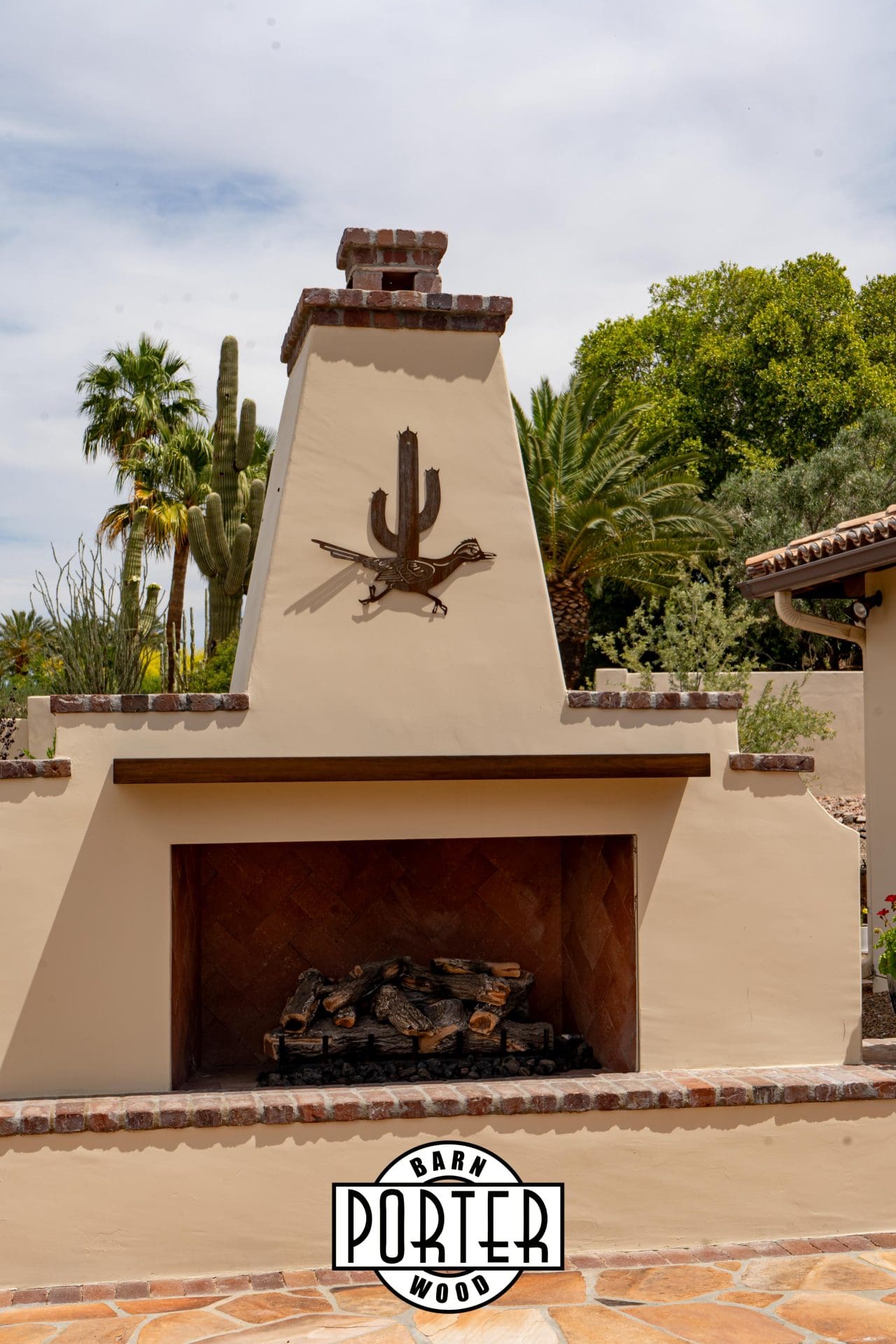 The outdoor patio area features a hard maple, edge-grain, butcher block fireplace mantel.