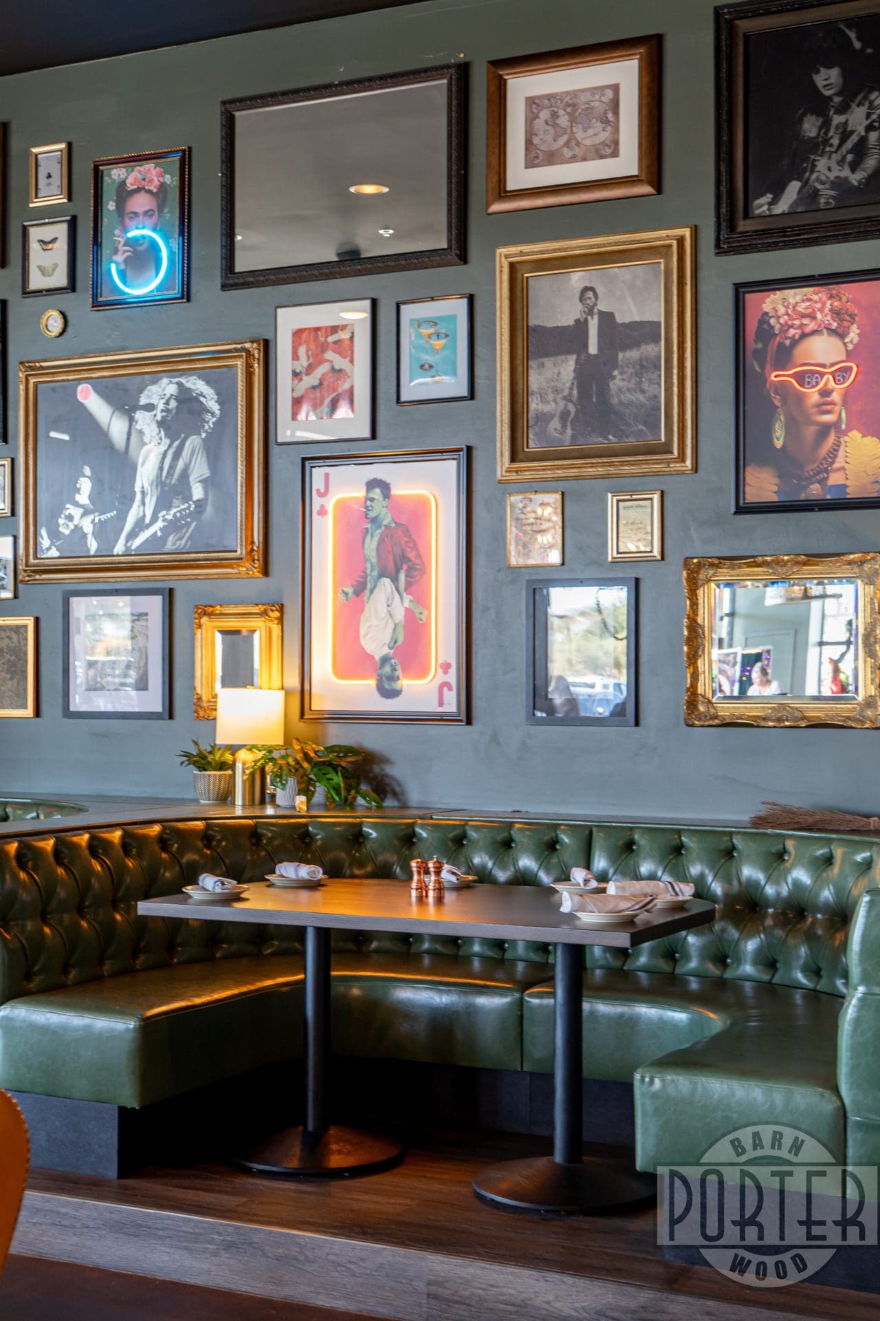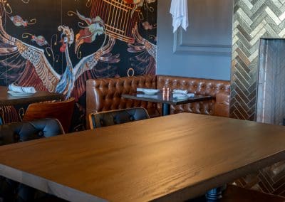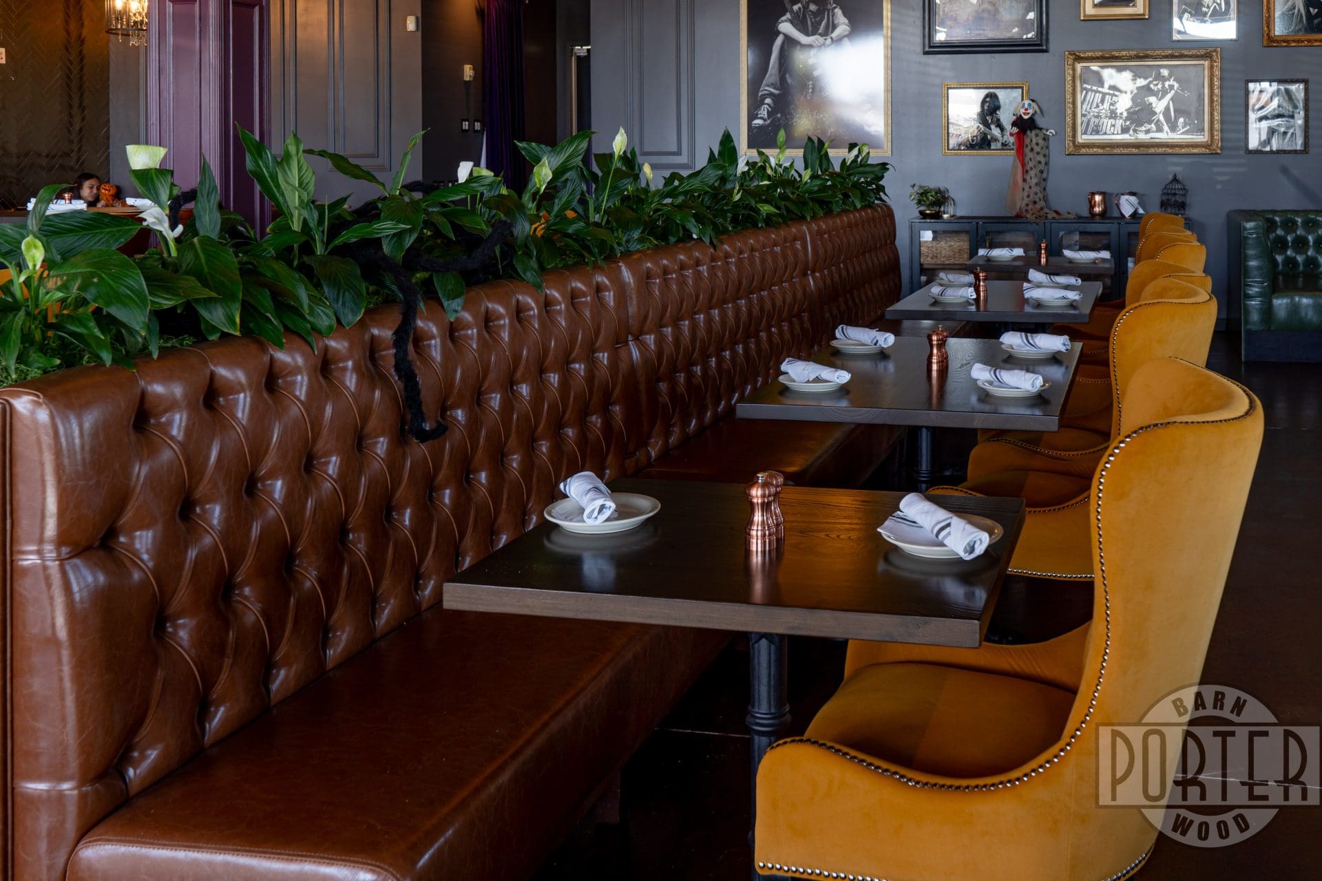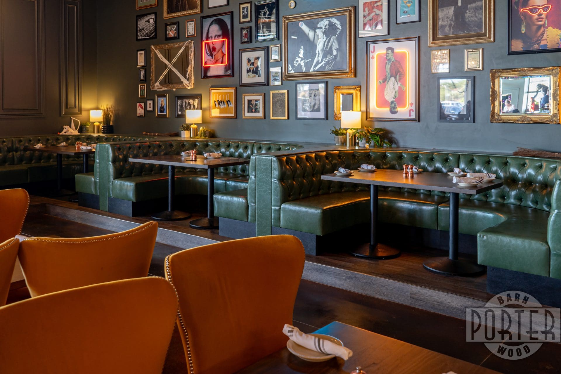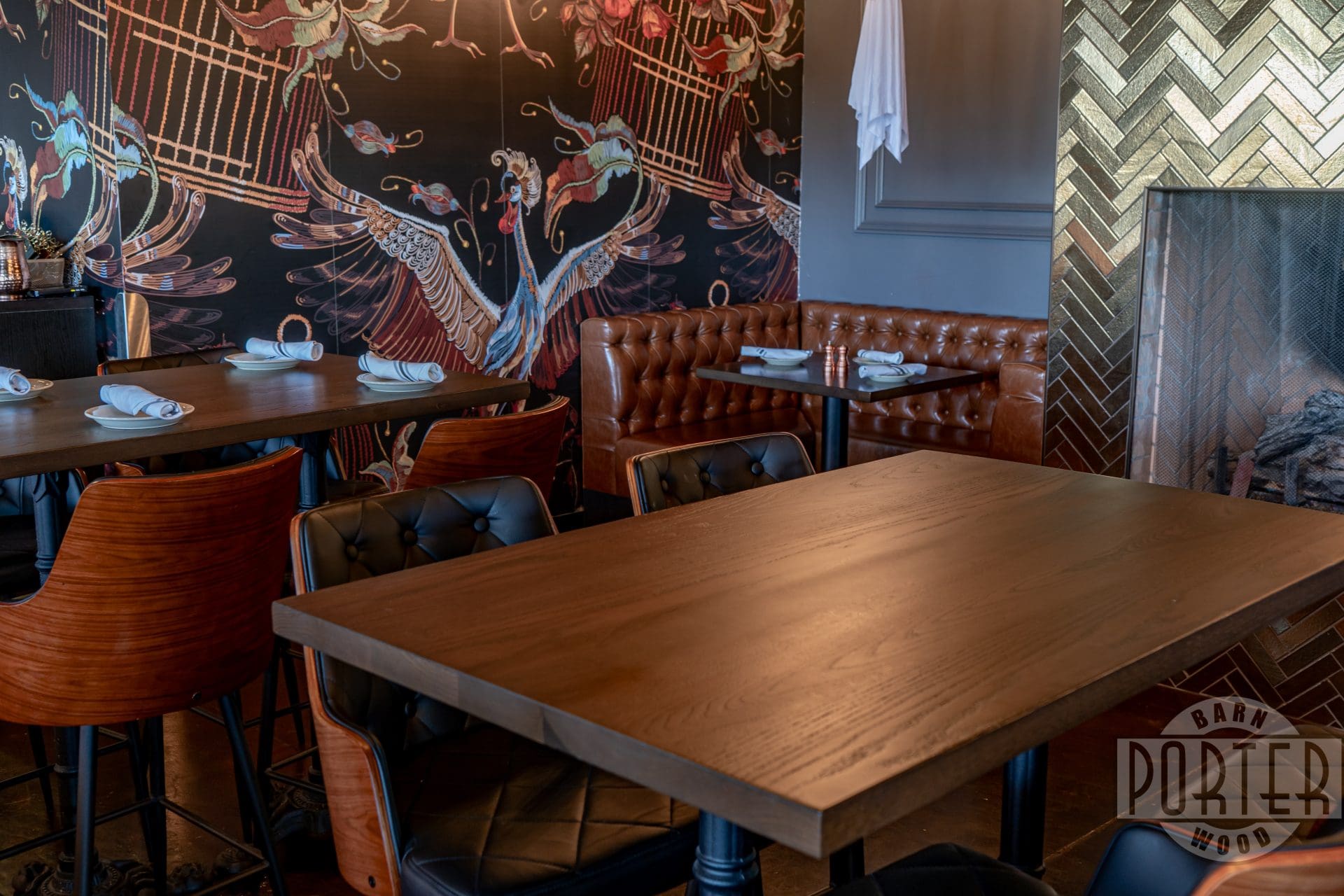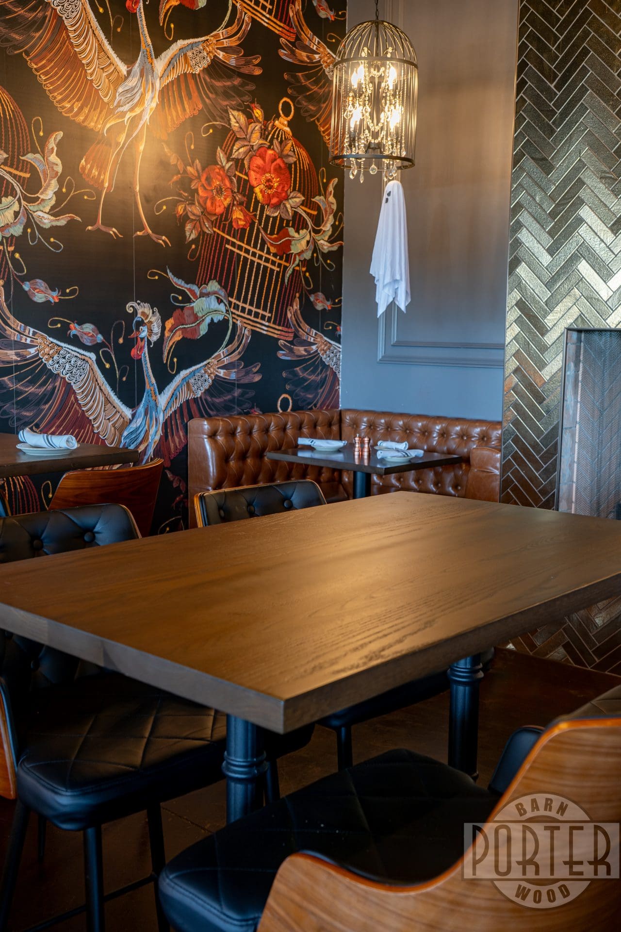 The interior of Lazy Bird in Peoria, Arizona, showcases custom mixed-hardwood tables alongside its selection of unique food and beverage options.