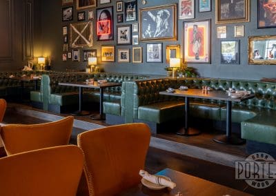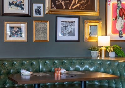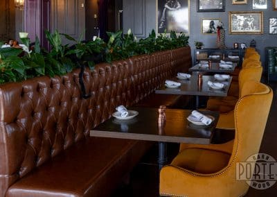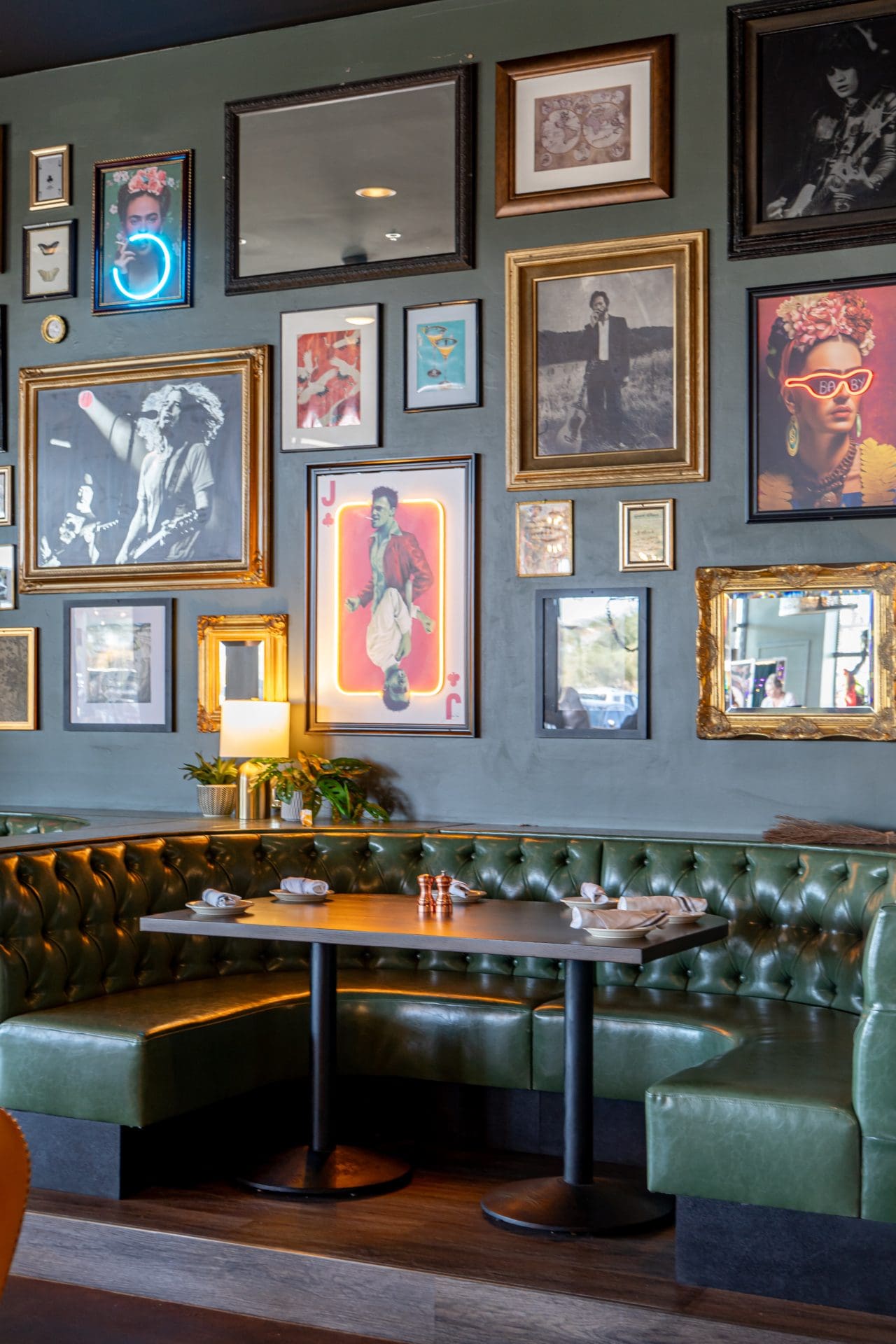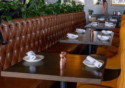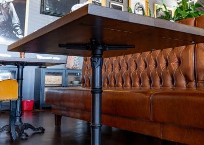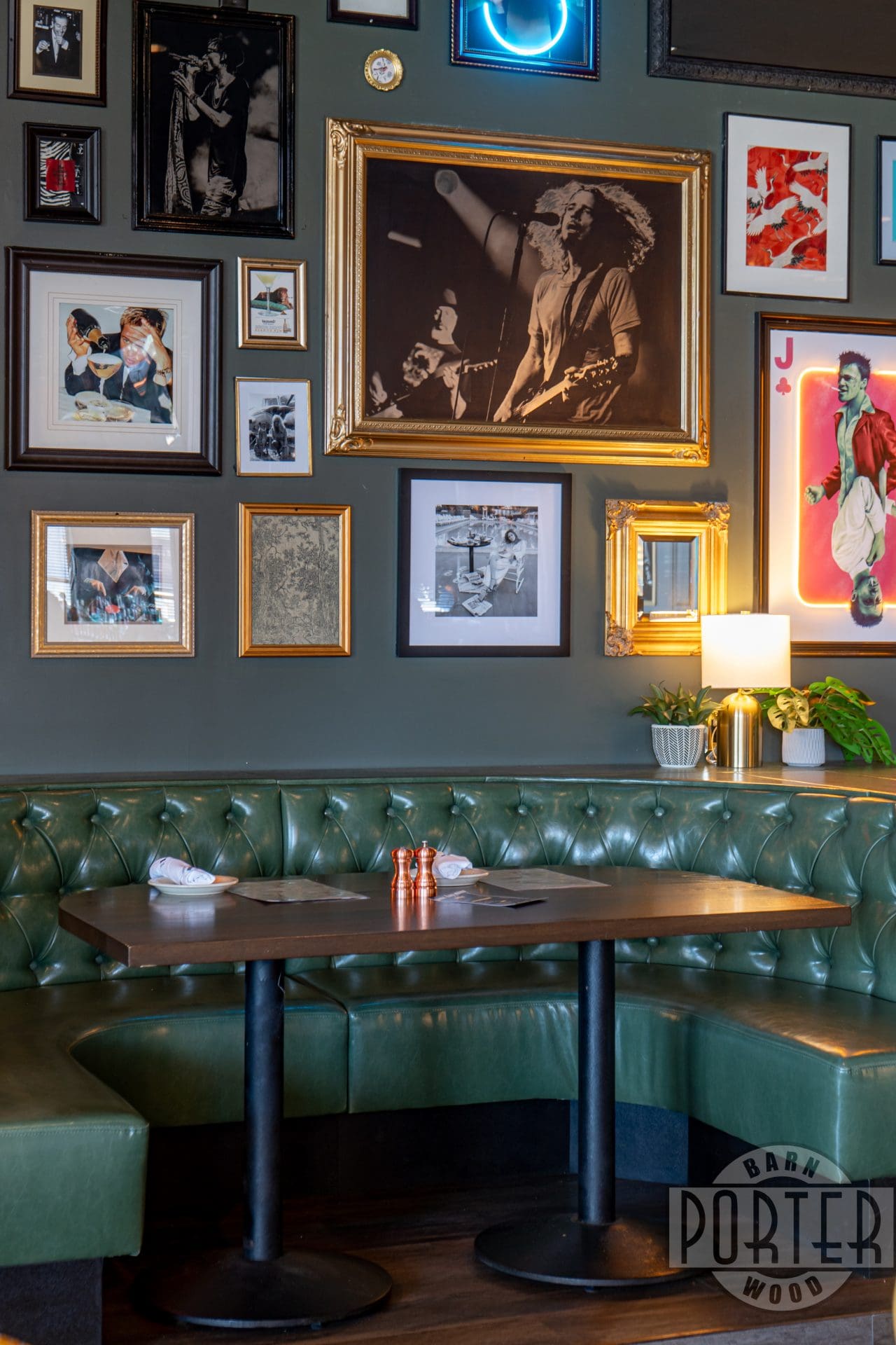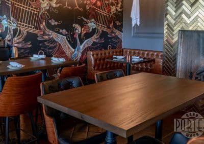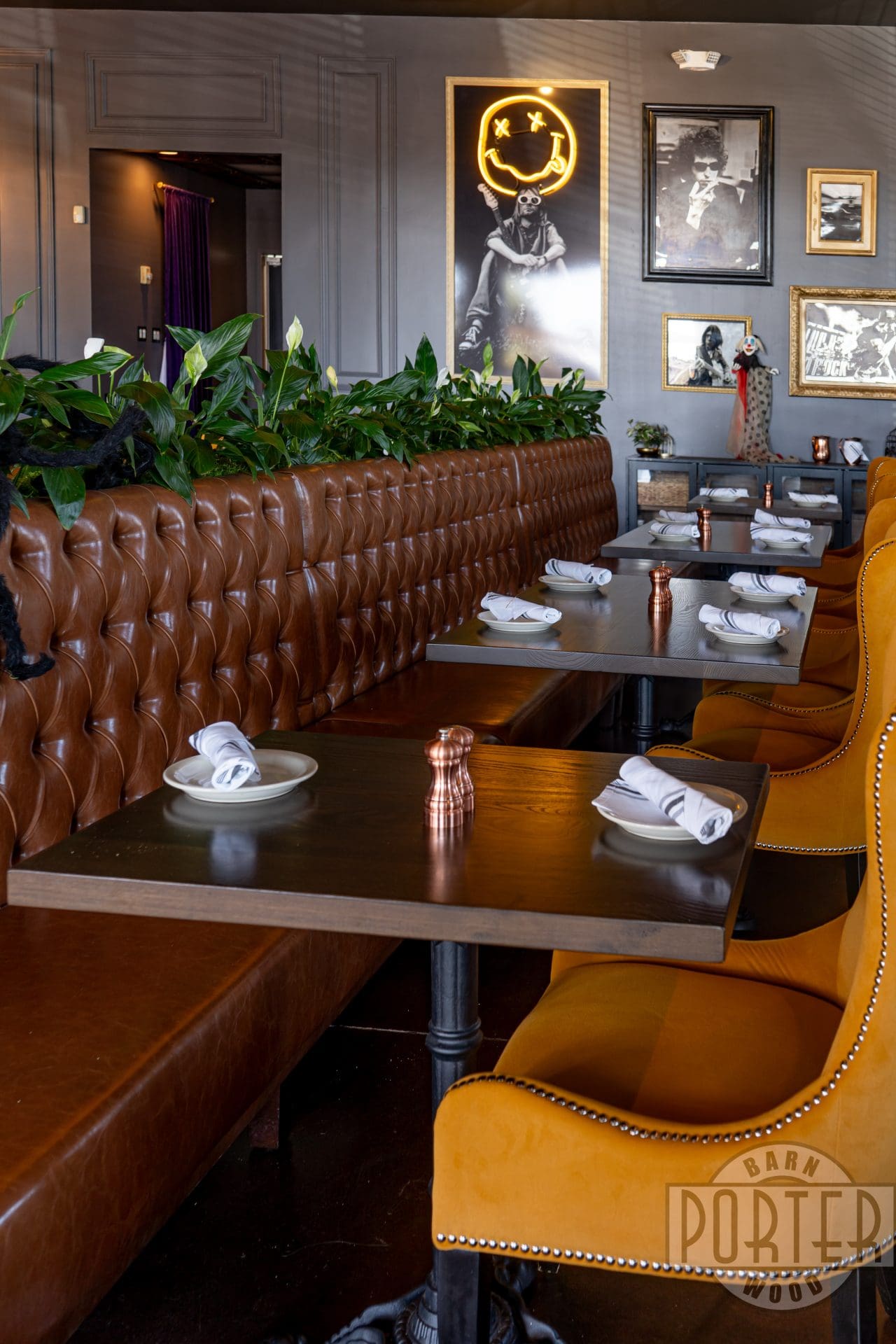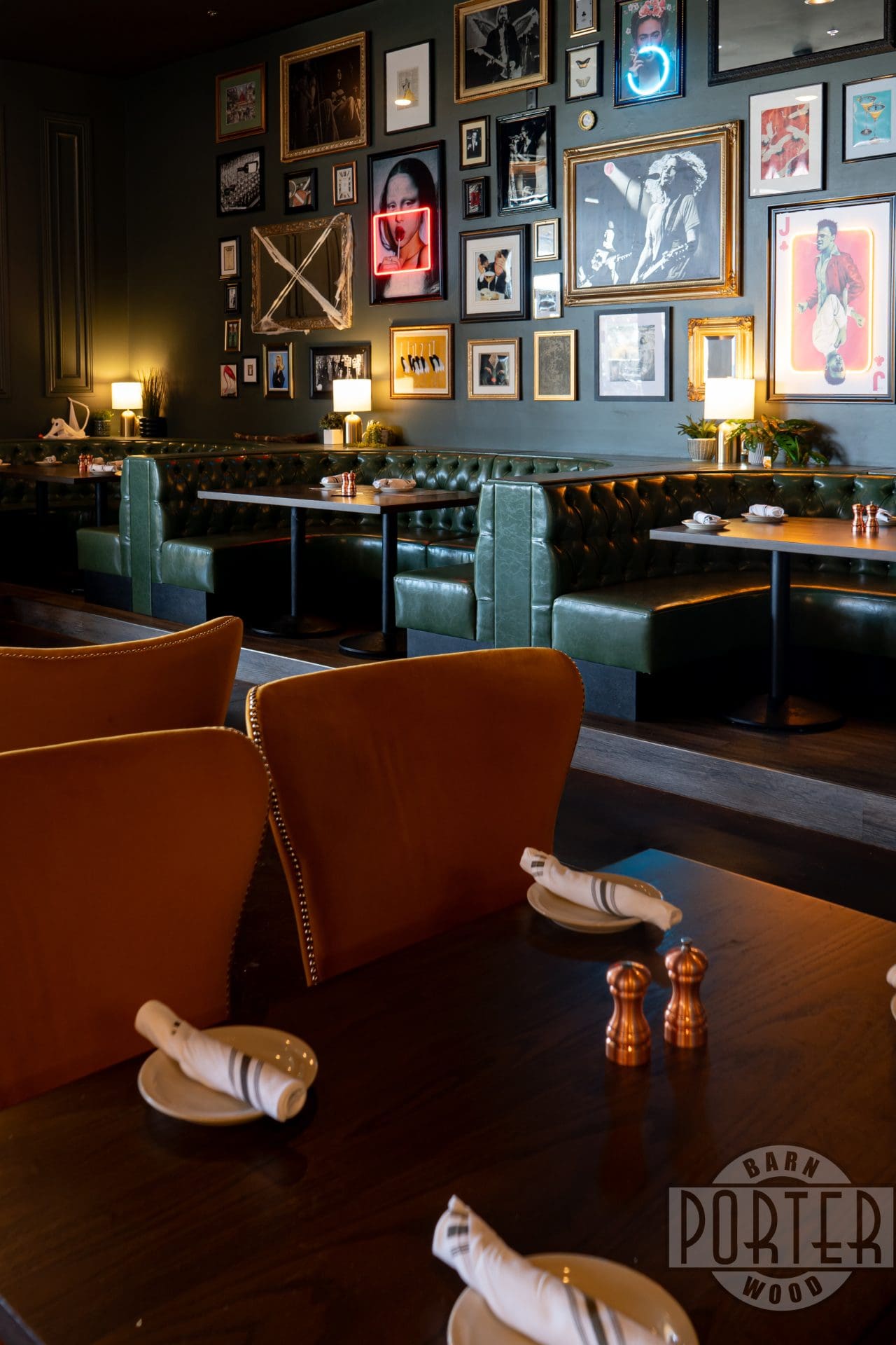 The interior of Lazy Bird in Peoria, Arizona, showcases custom mixed-hardwood tables alongside its selection of unique food and beverage options.