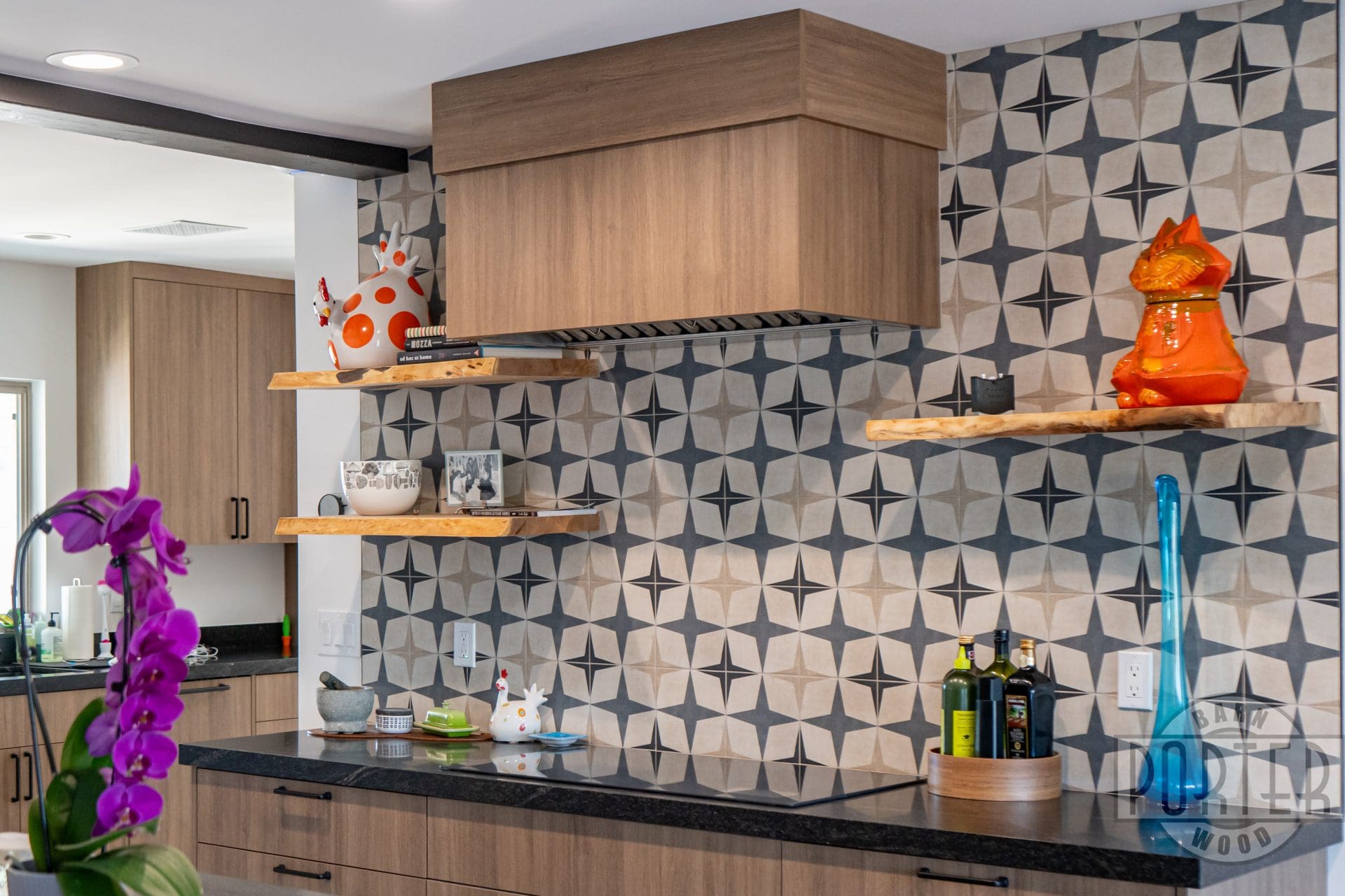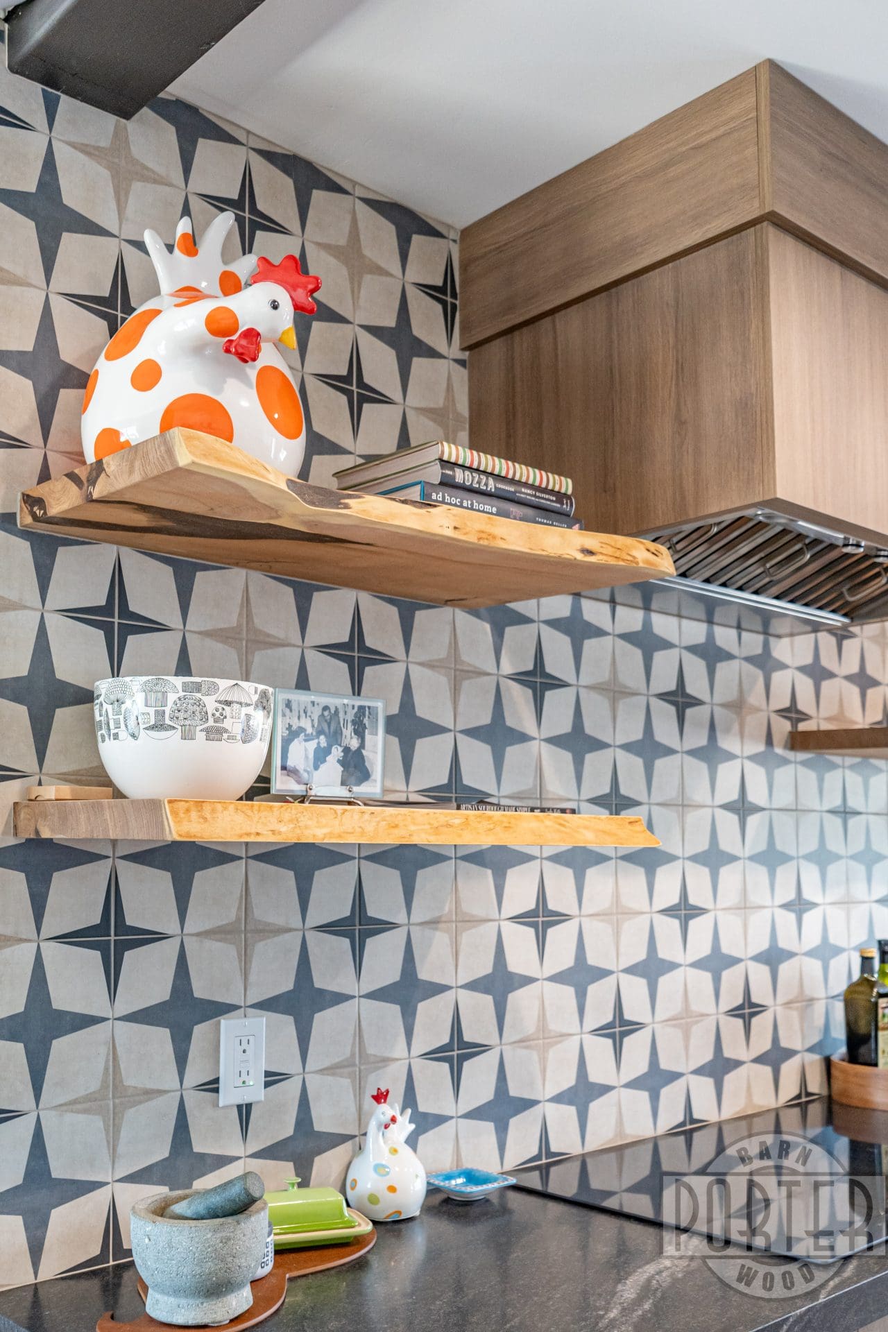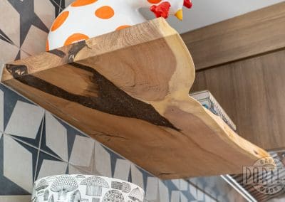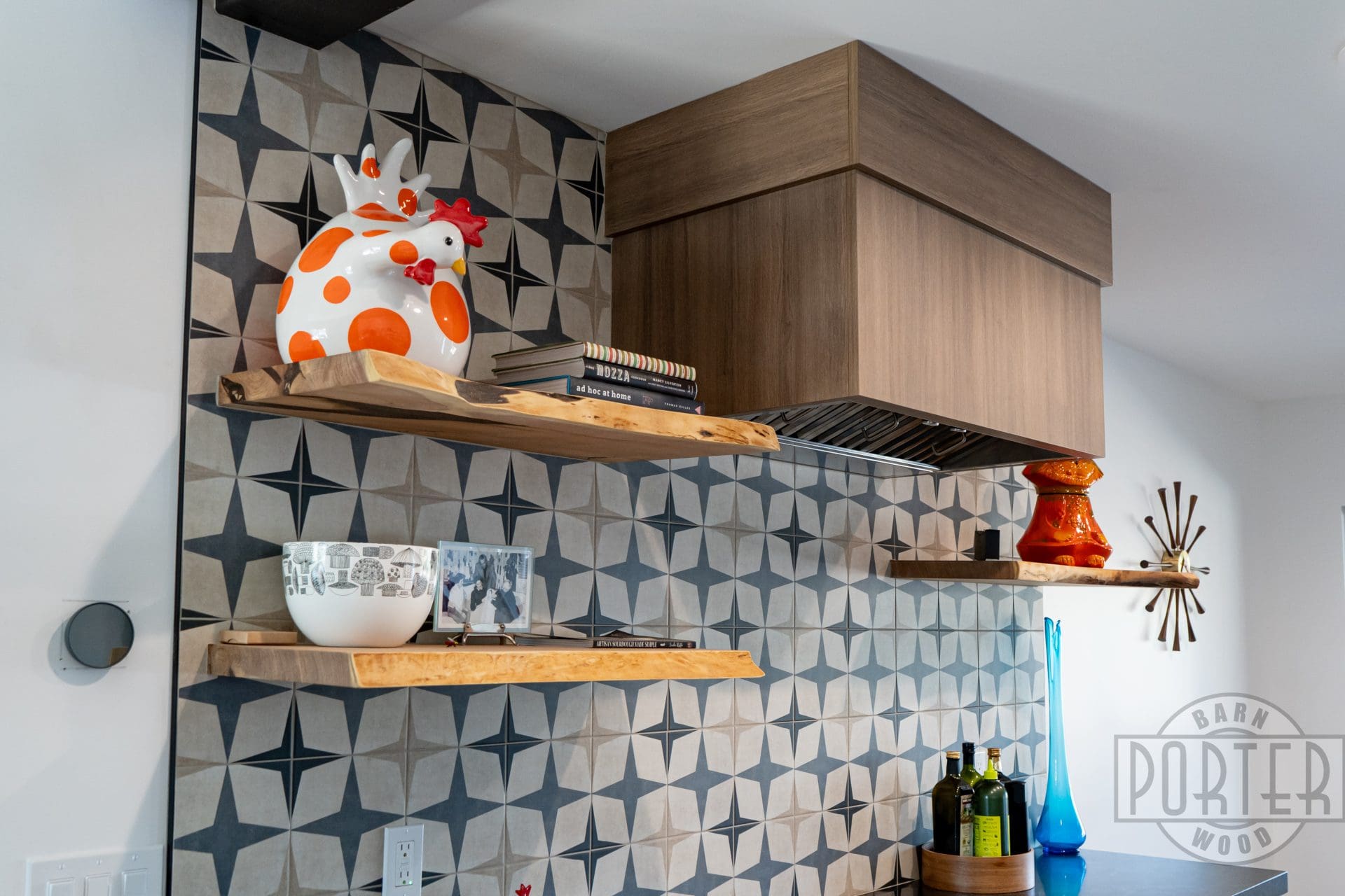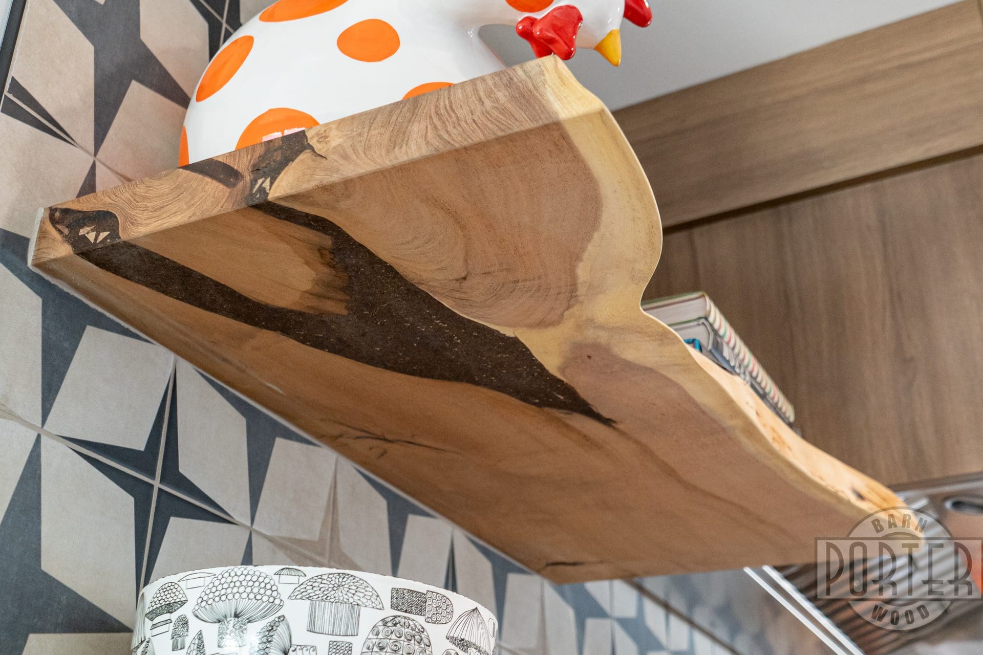 This kitchen is open, and items are easily accessible from these live-edge mesquite shelves .