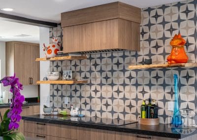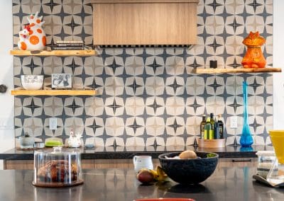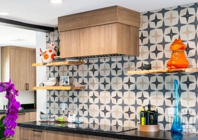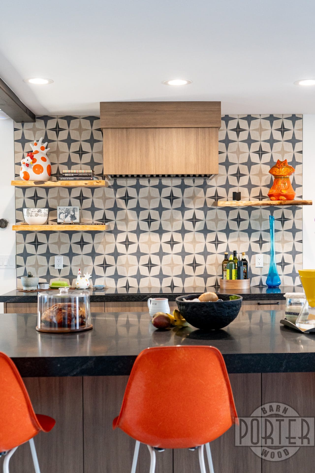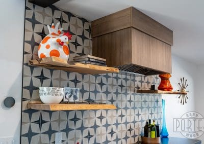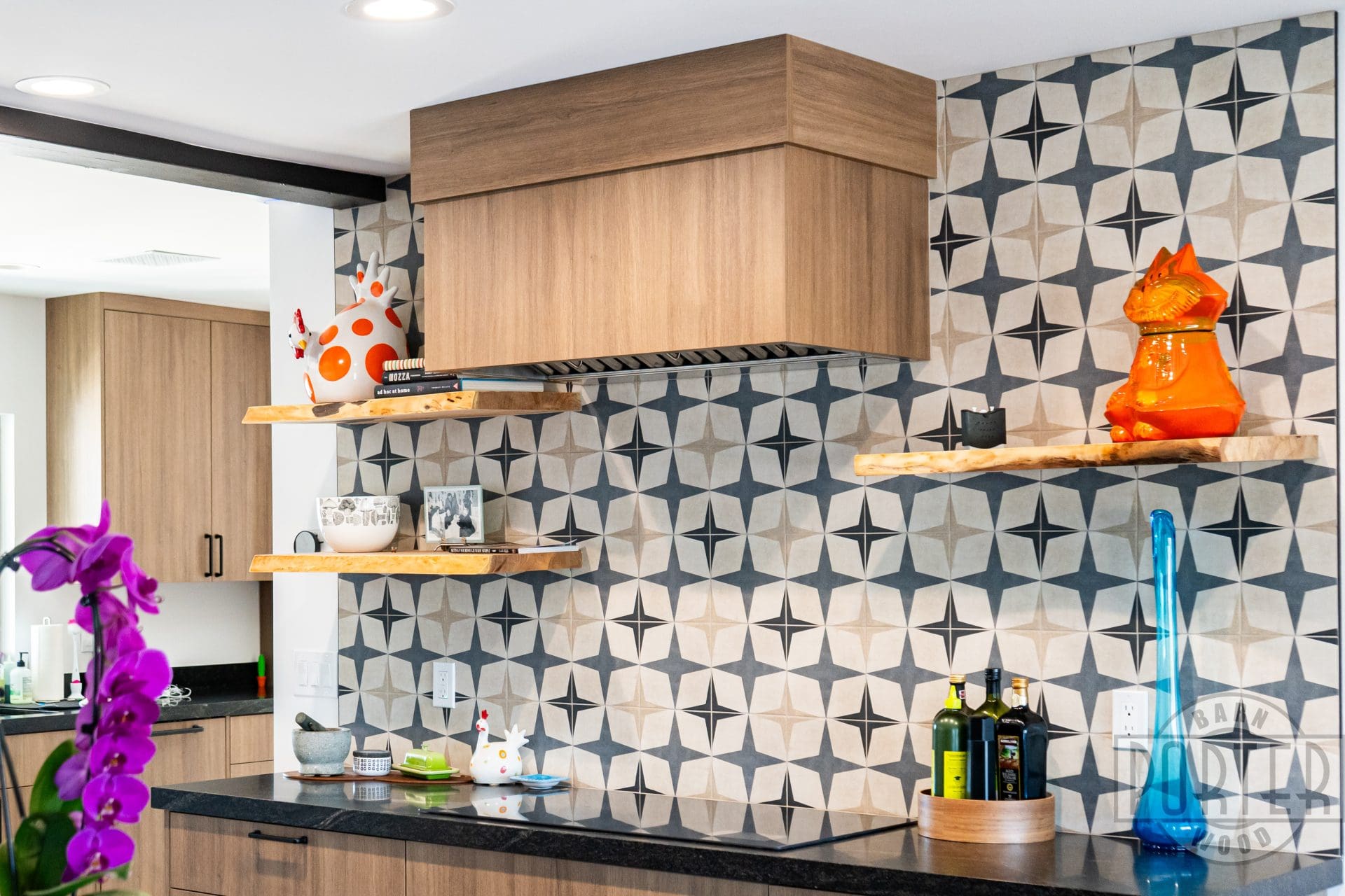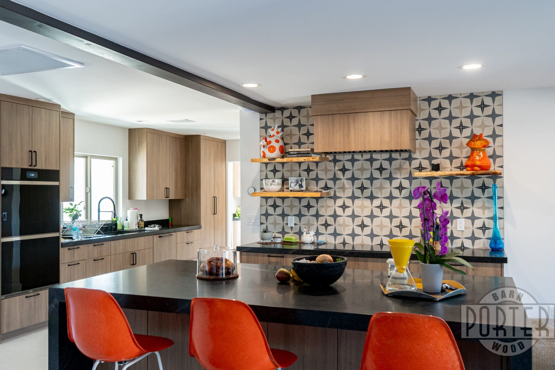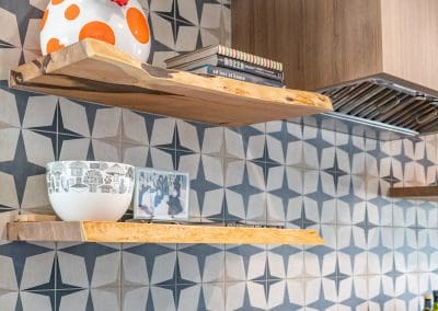 This kitchen is open, and items are easily accessible from these live-edge mesquite shelves .