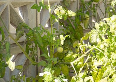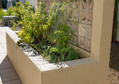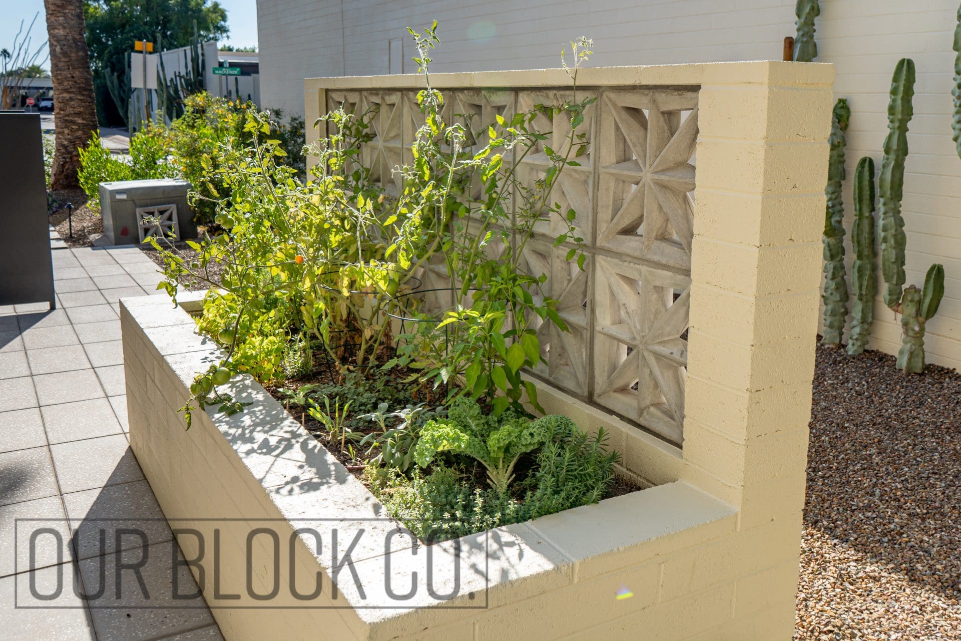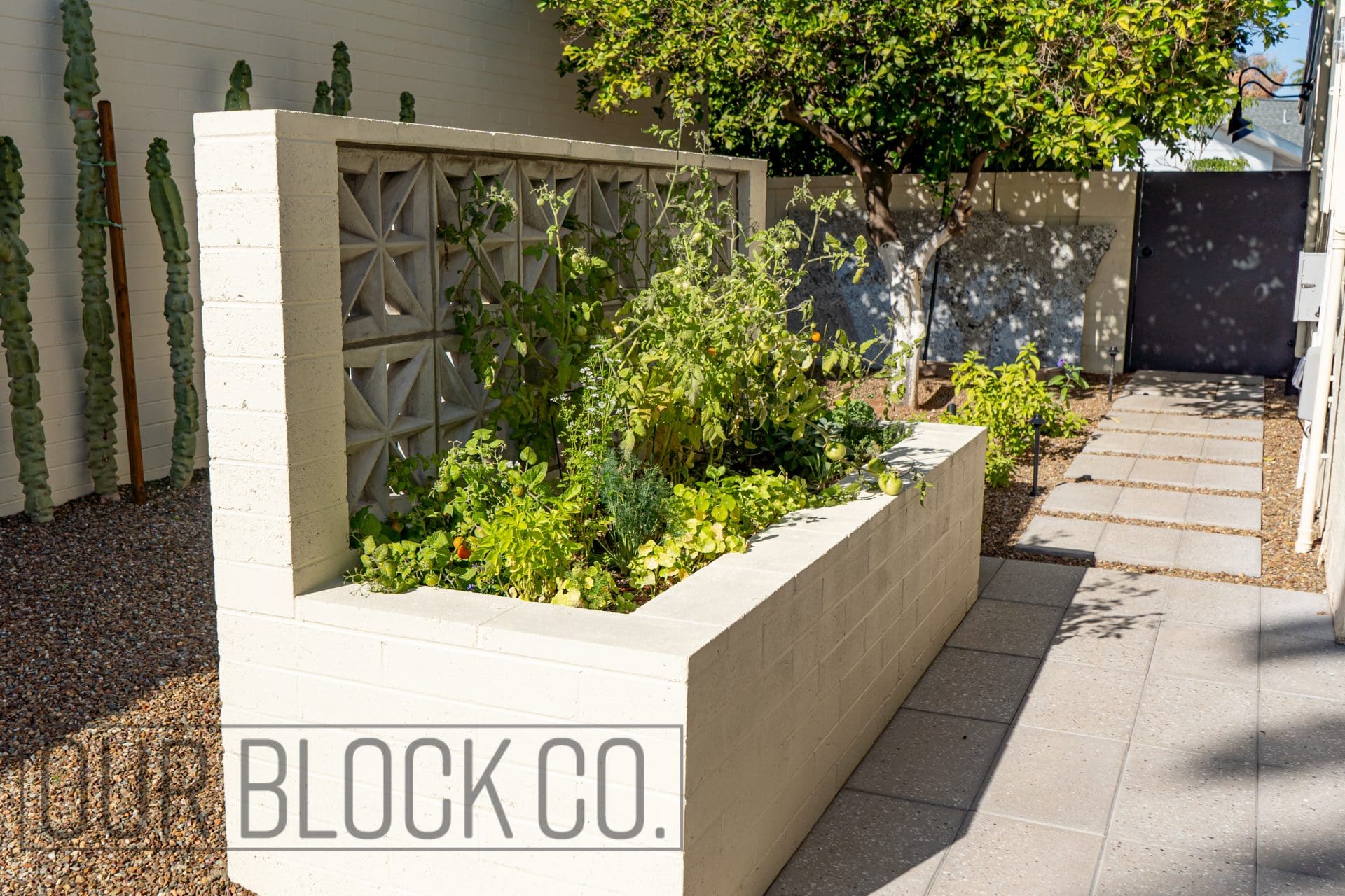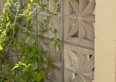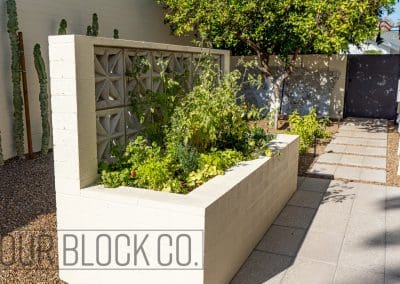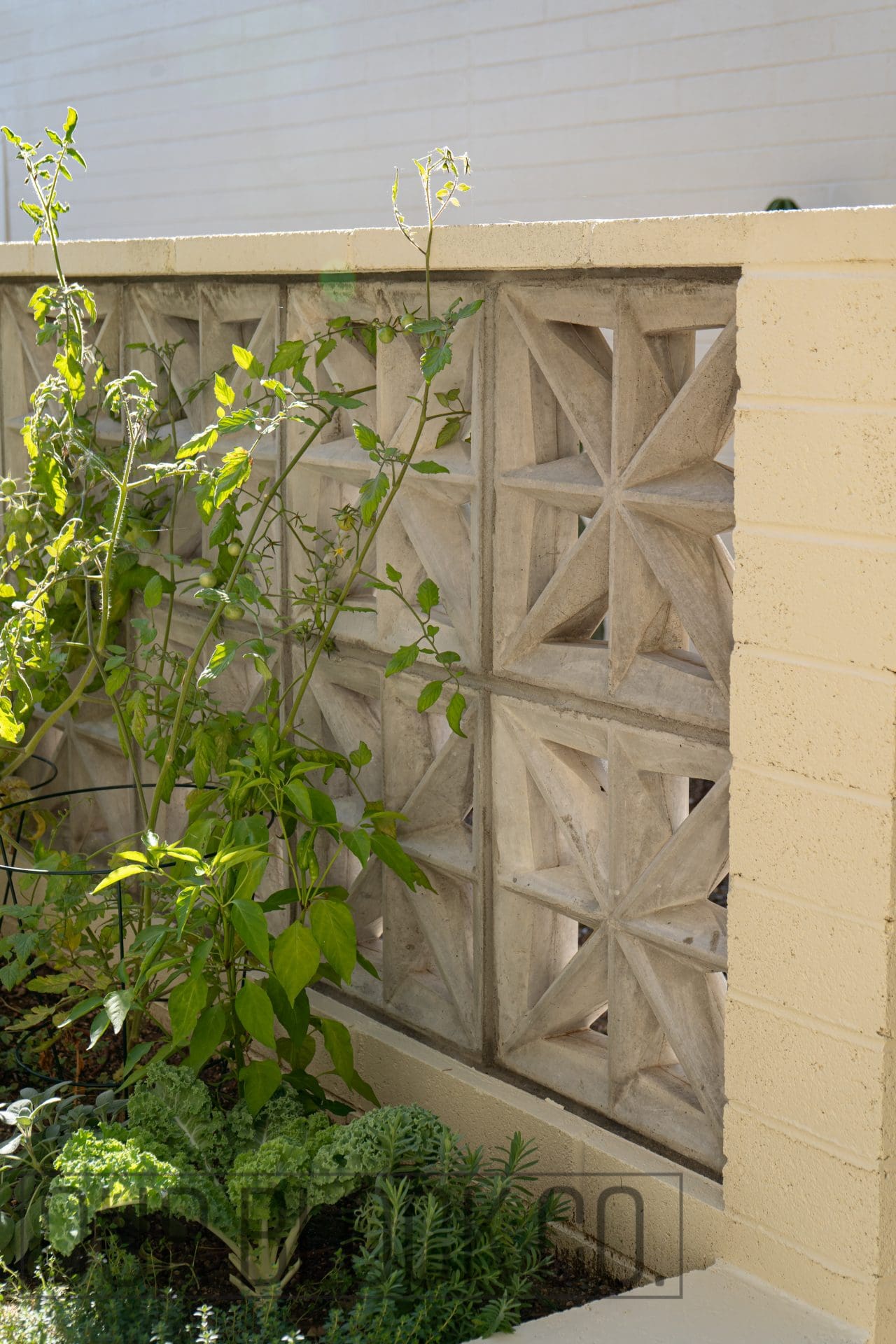 The signature breeze-block wall offers protection for the raised-bed garden, maintaining airflow and adding architectural structure