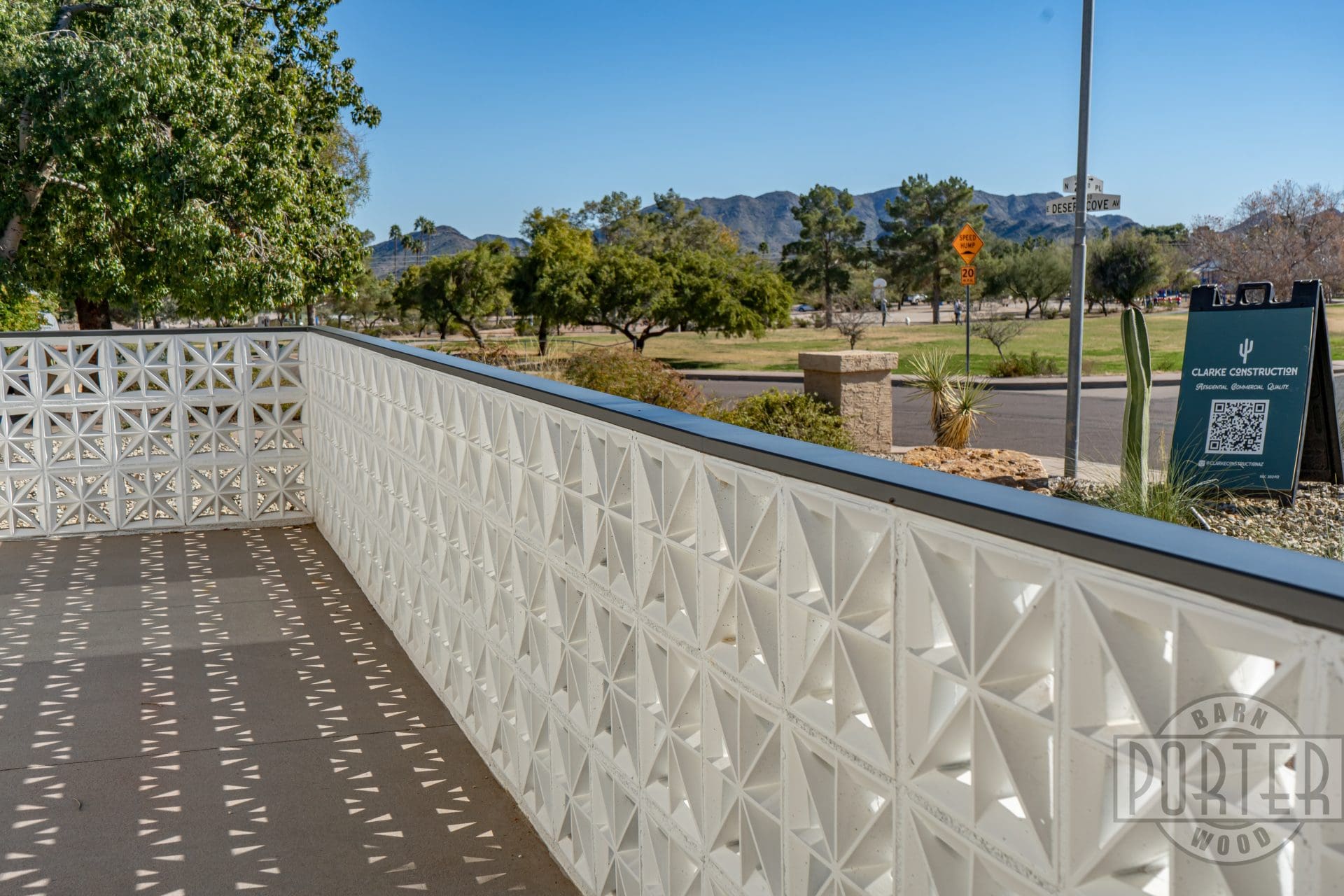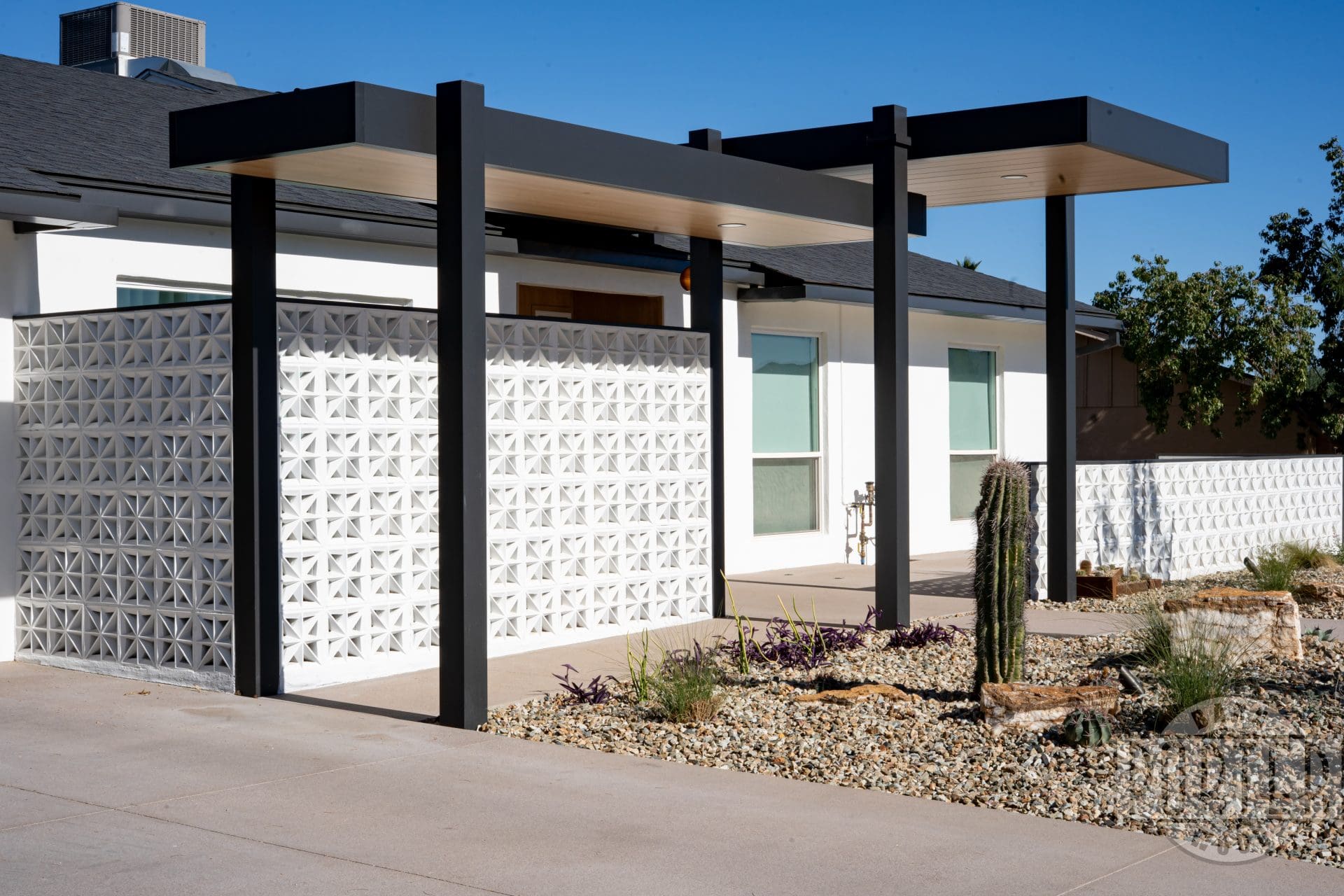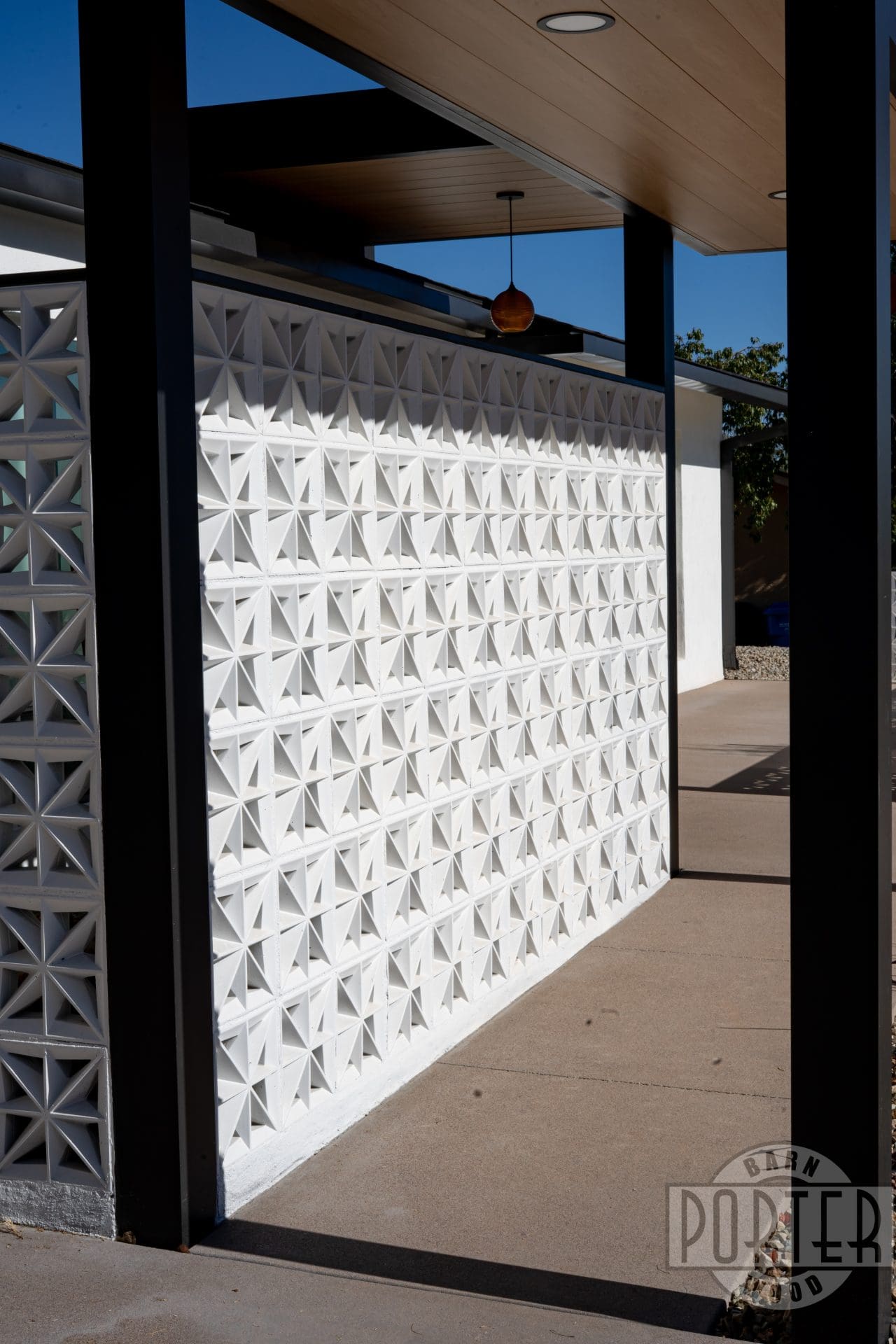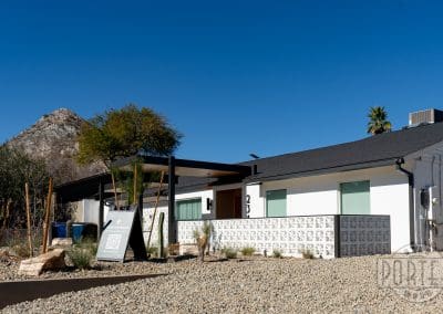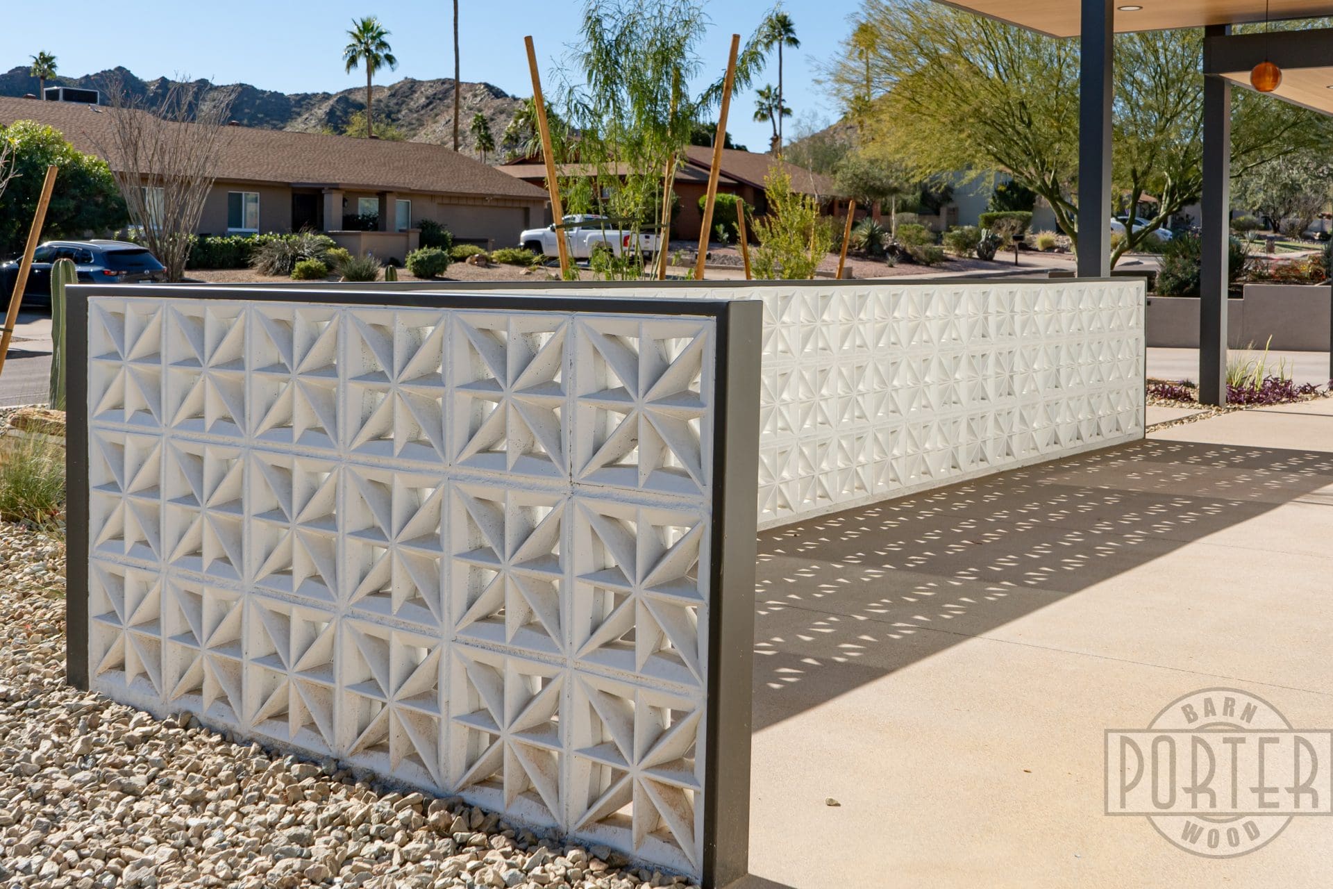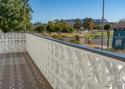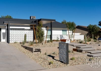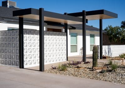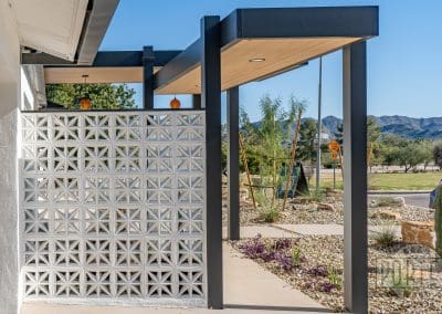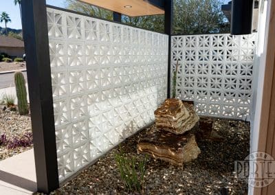 The custom breeze-block wall welcomes guests and gives privacy for patio entertaining. In addition, it serves to minimize heat entering the home from the strong Arizona sun. It’s a good combination of aesthetics and functionality.