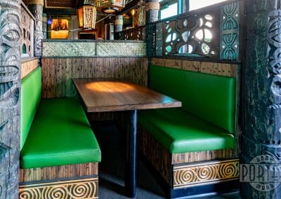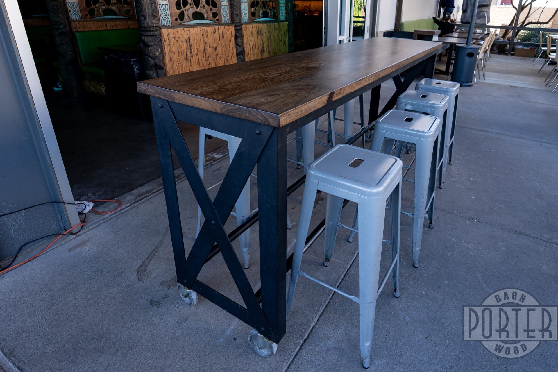 Surf City in Gilbert, Arizona, showcases custom walnut tables amid their well apppointed tiki themed resataurant. Our custom-fabricated steel bases make a solid support for each piece.