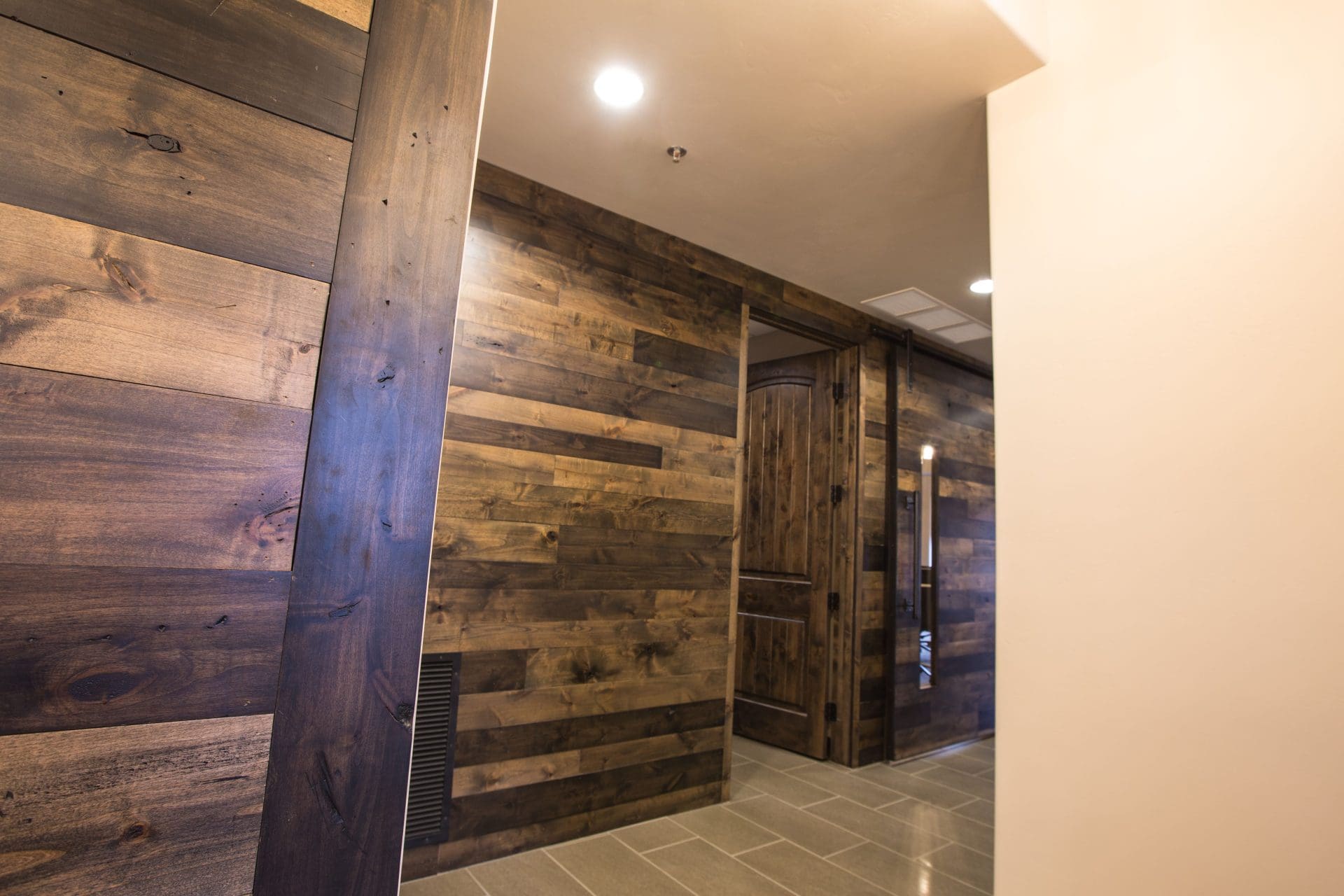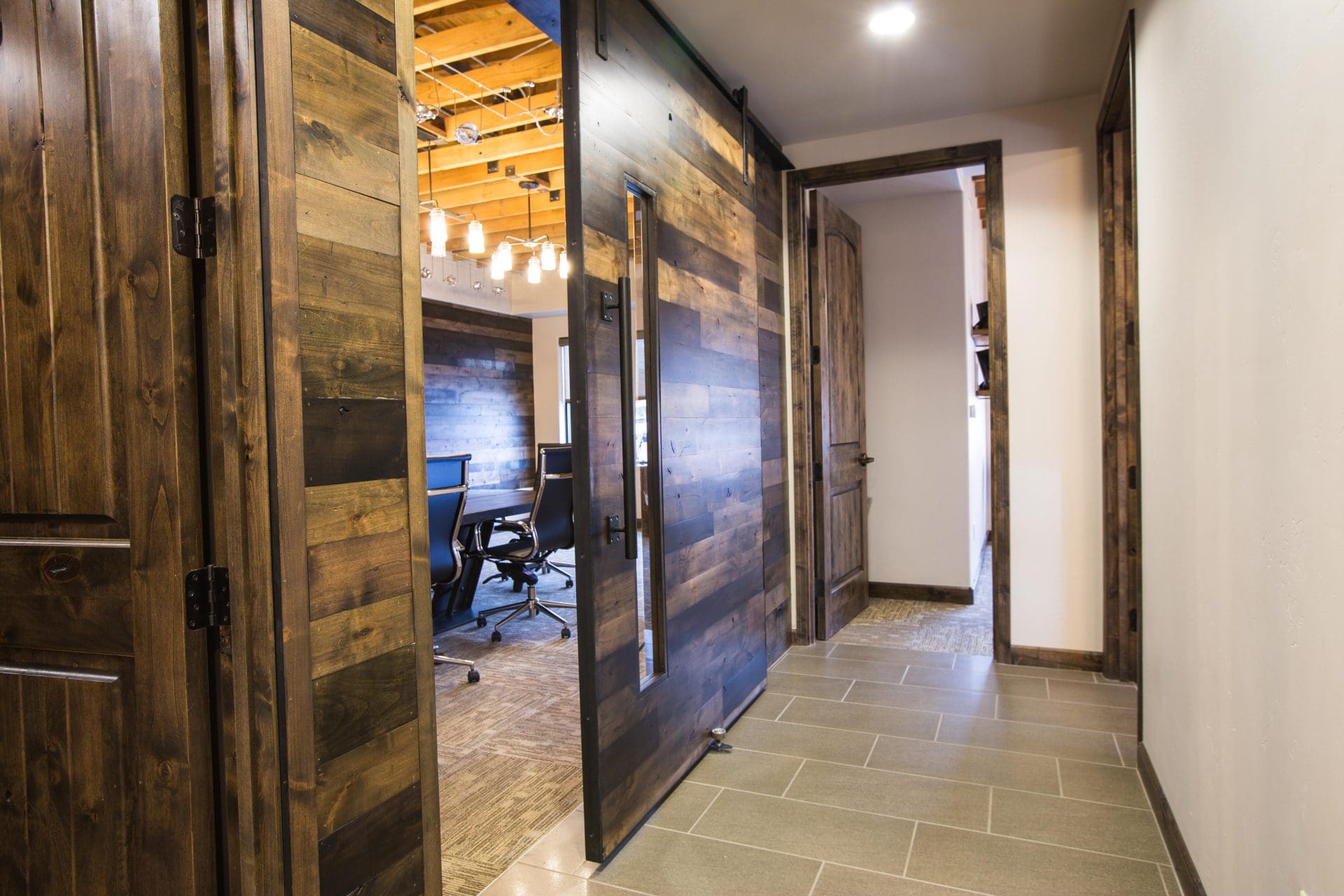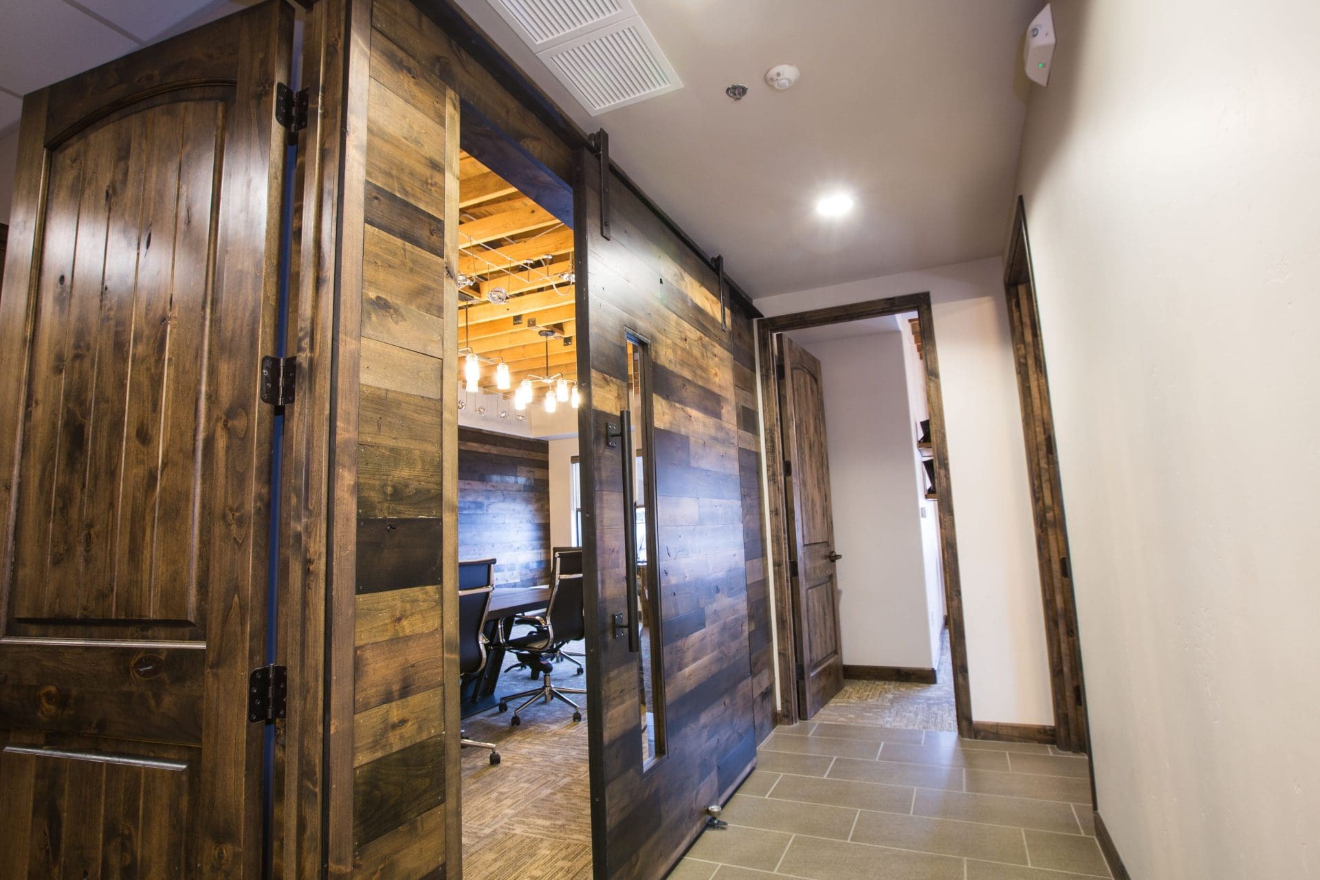 The Spencer Companies needed a nice door to close off the conference room in their new space. This one matches the same 3-tone coloration of the walls and cabinetry in the space and has a vertical viewing window near the custom modern handle of the door. You’ll see other Porter Barn Wood builds in these photos as well.
