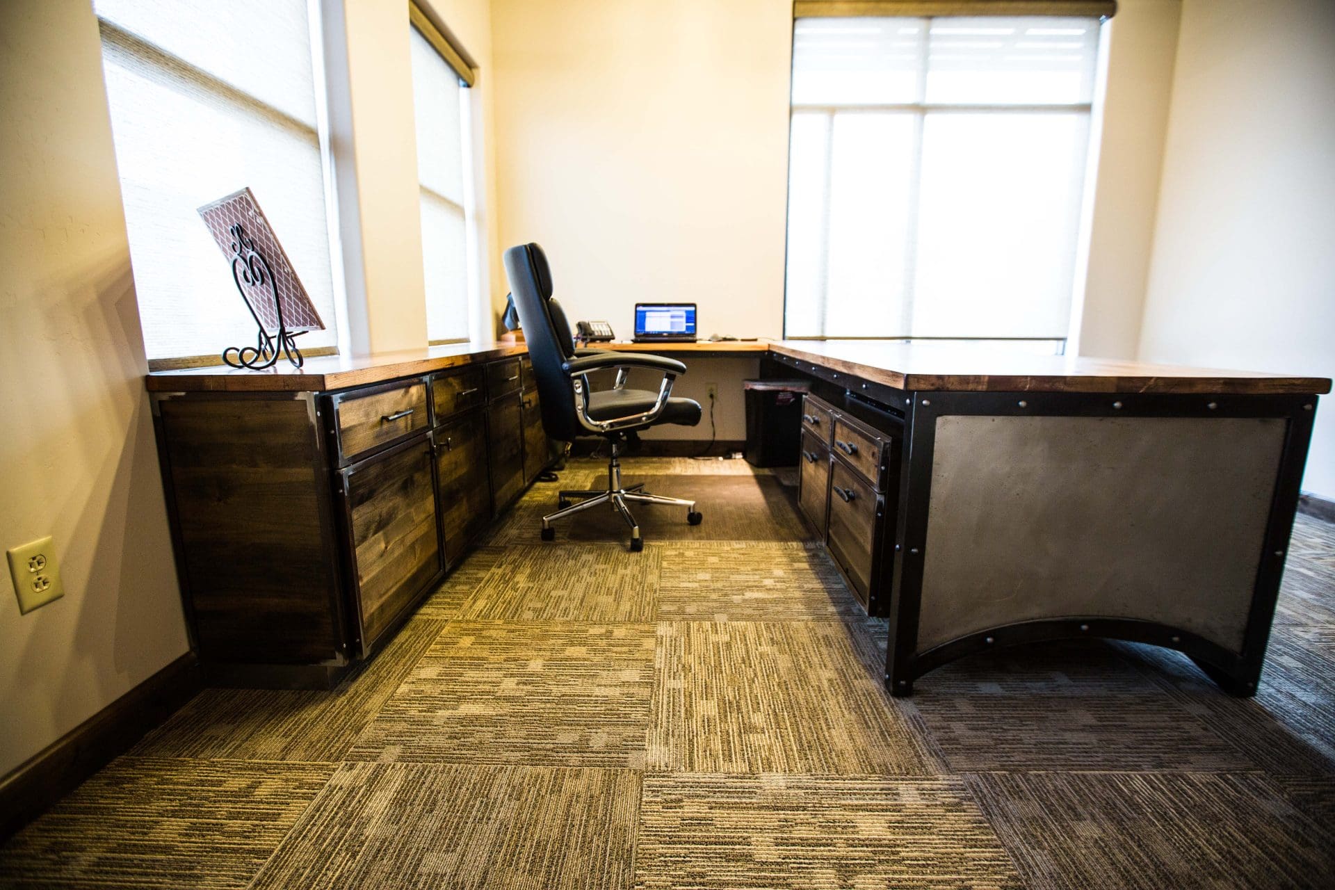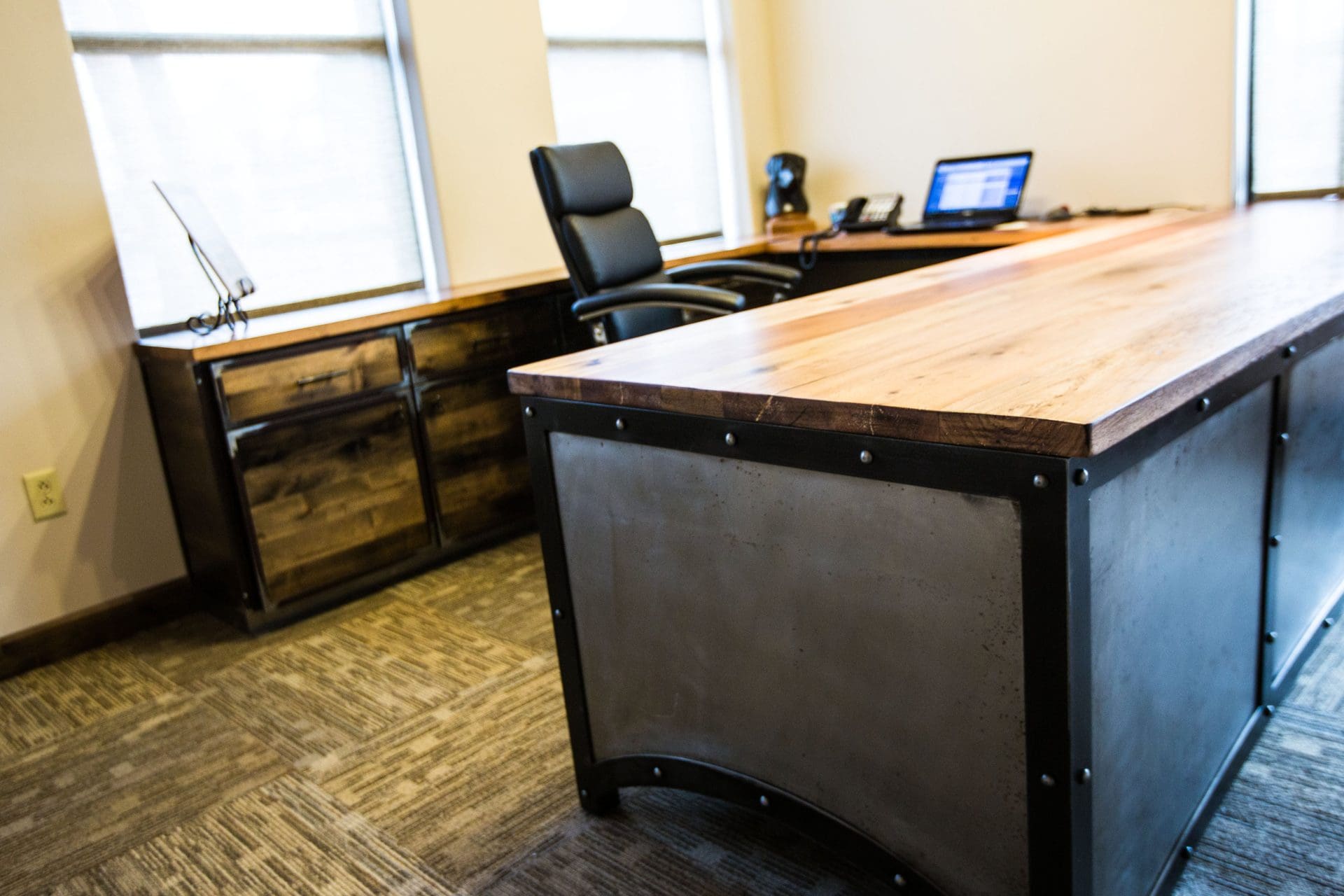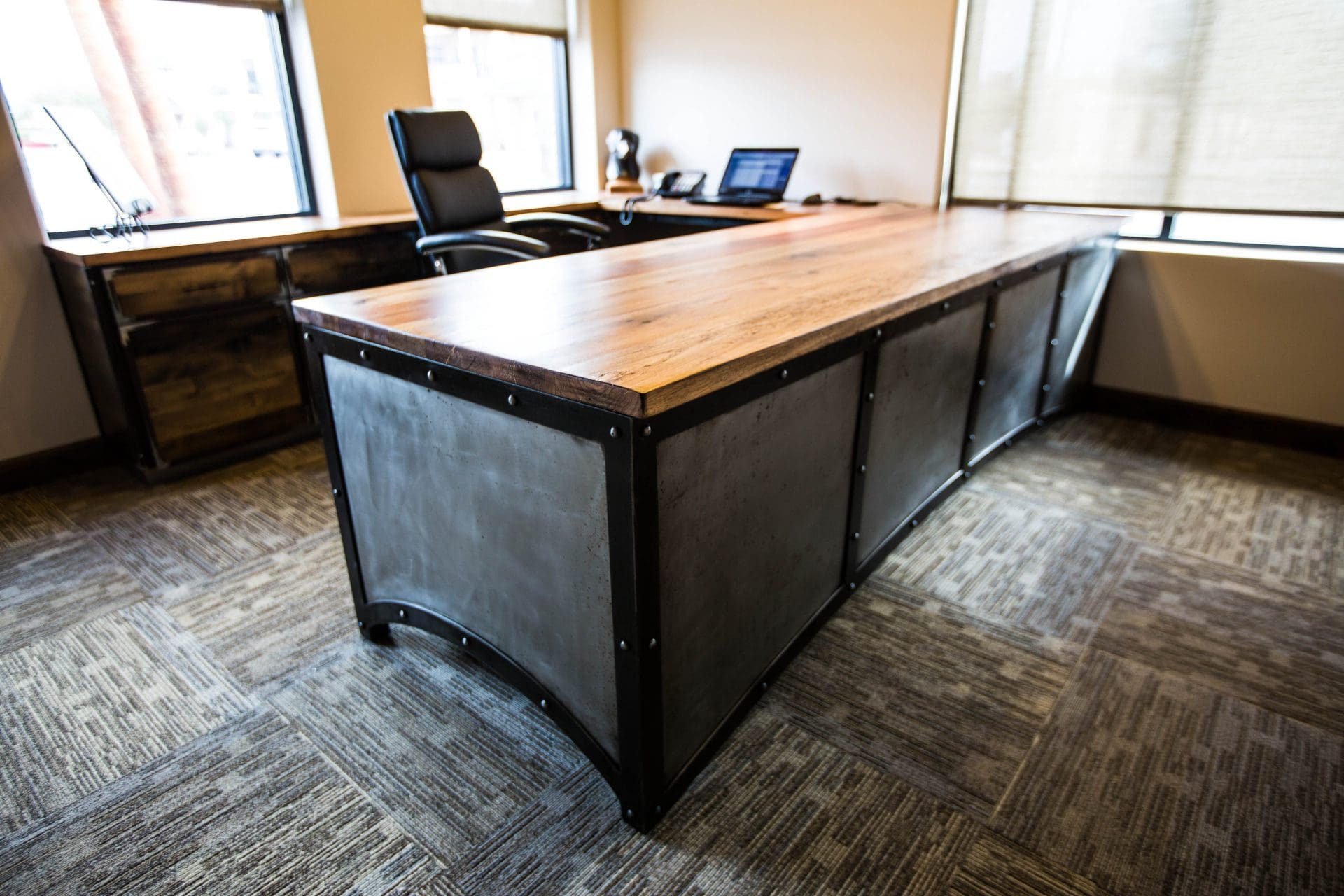 Every big boss needs a desk. This one is a whole lot of fun! File drawers, shelves, pencil drawers, lots of desktop space, and grommets for tech. The reclaimed hardwood tops are colorful and organic looking and the steel gives it the industrial edge. The mix of cold rolled and hot rolled steel gives the metal contrast. We used some boat hardware for the handles on the floating cabinet underneath the main desk, and distressed/blackened stainless pulls on the rest. The wood fronts to the cabinets are what we call 3-tone Yuma alder. The color was very specific to this job and has a hint of grey in it. This is a very neat office space (Spencer Companies) filled with lots of Porter Barn Wood furniture and textures.