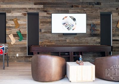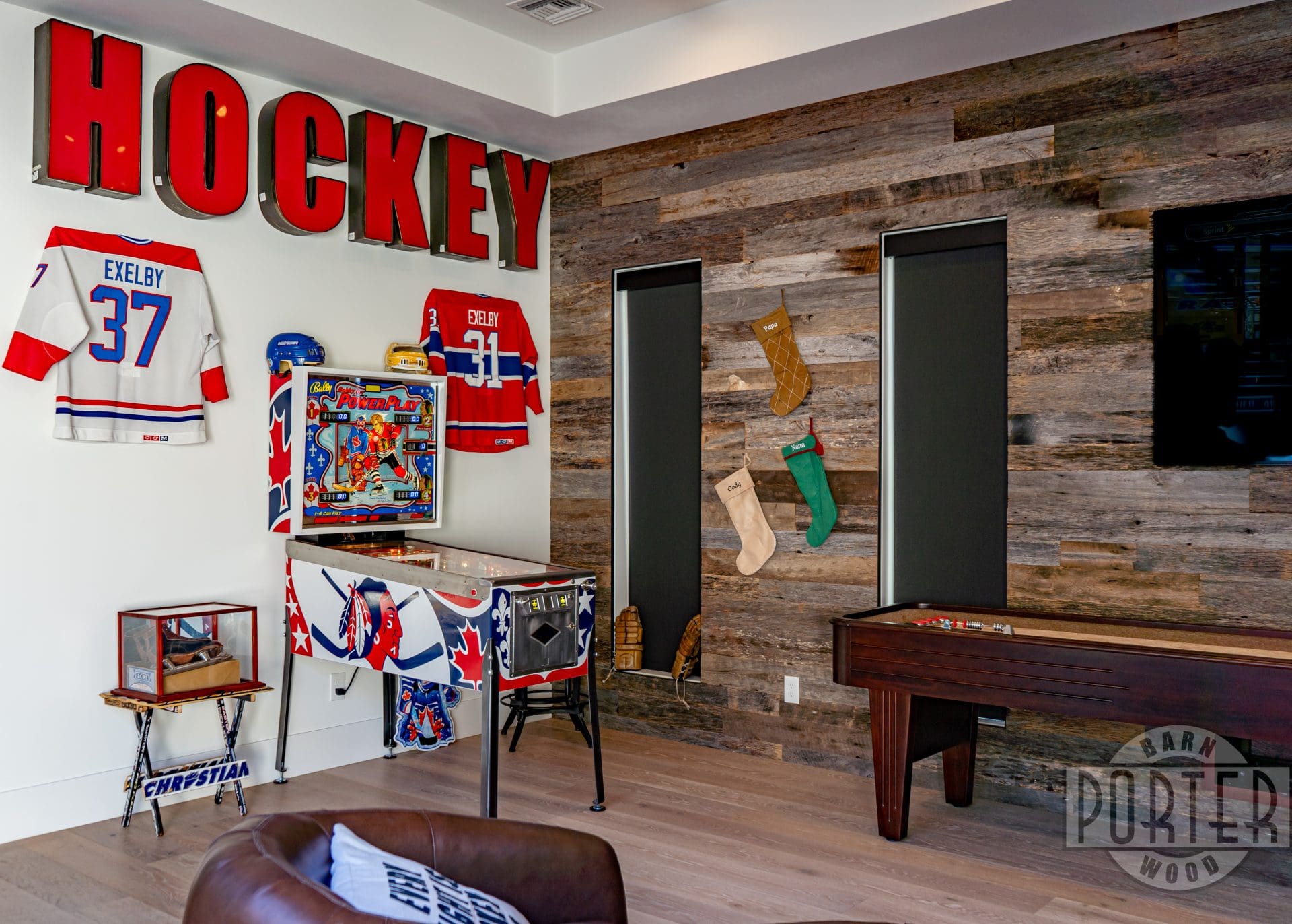 The rugged texture of the tobacco barn gray accent wall is a perfect match for a hockey-themed game room.