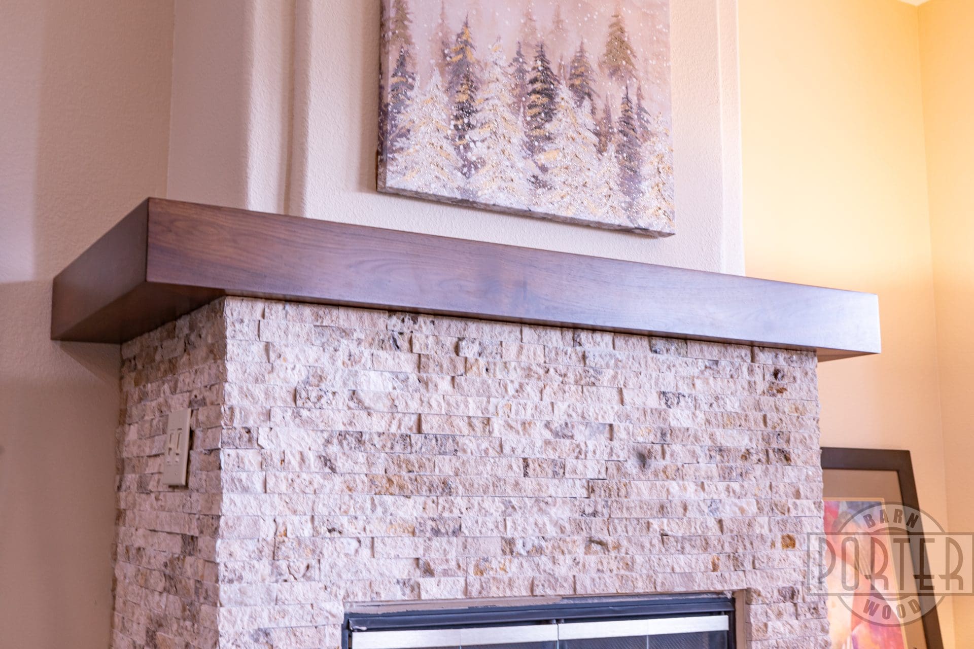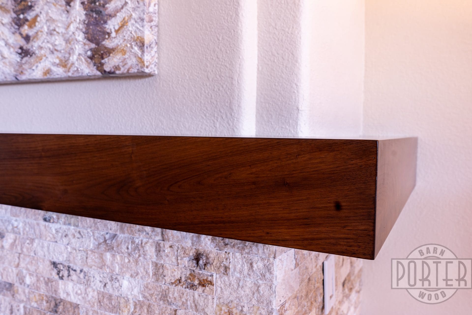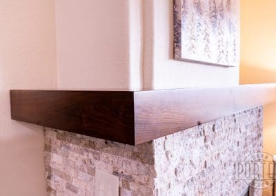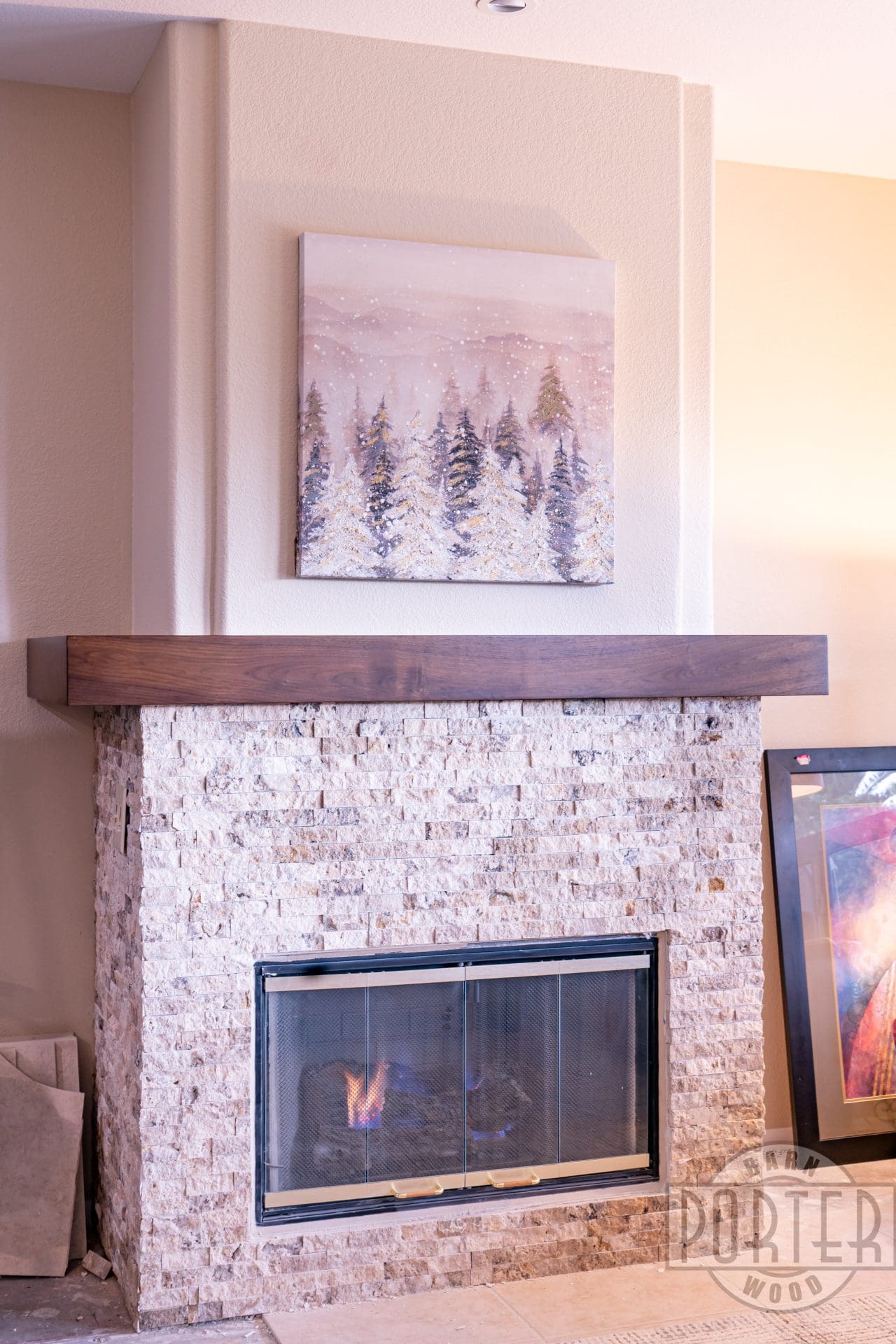 The warm walnut tones of the mantel frame the fireplace and welcome the winter weather.